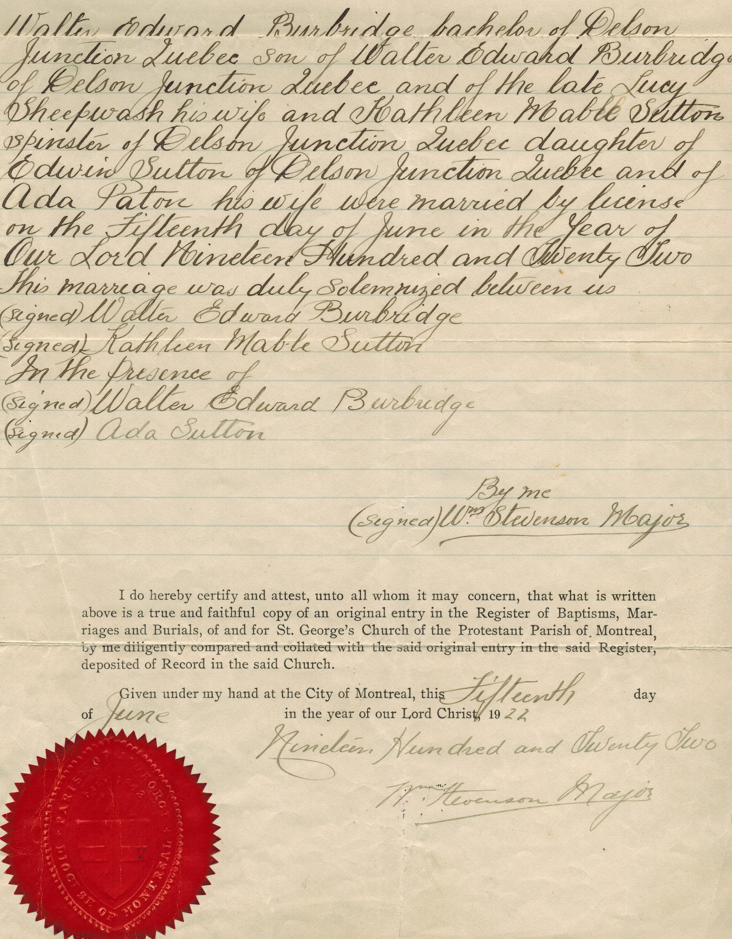 Kathleen Sutton, the third cousin twice-removed on the mother's side of Nigel Horne, was born in Croydon, Surrey, England on Aug 1, 19001,2, was baptized in Thornton Heath, London, England on Nov 8, 1900 was married twice - to Walter Burbridge (on Jul 15, 1922 in Montreal, Quebec, Canada) William Friend. She had 2 children, both with Walter Burbridge: Ruth Doris and Gladys Ada. On Mar 31, 1901, she lived at 41 Bensham Grove in Thornton Heath1.