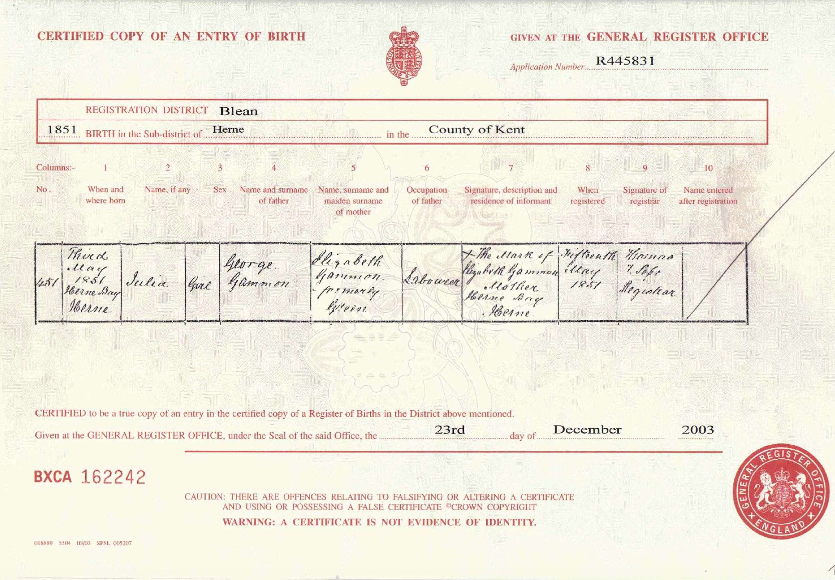 Mary Gammon, the wife of James Mount (the first cousin four-times-removed on the mother's side of Nigel Horne), was born in Herne Bay, Kent, England on May 3, 18511 and married James (a stoker at gasworks with whom she had 7 children: Harry, Edward Thomas, Rose E, Jane, Stephen, Ernest and Frederick) at Christ Church in Herne Bay on Apr 30, 18762.