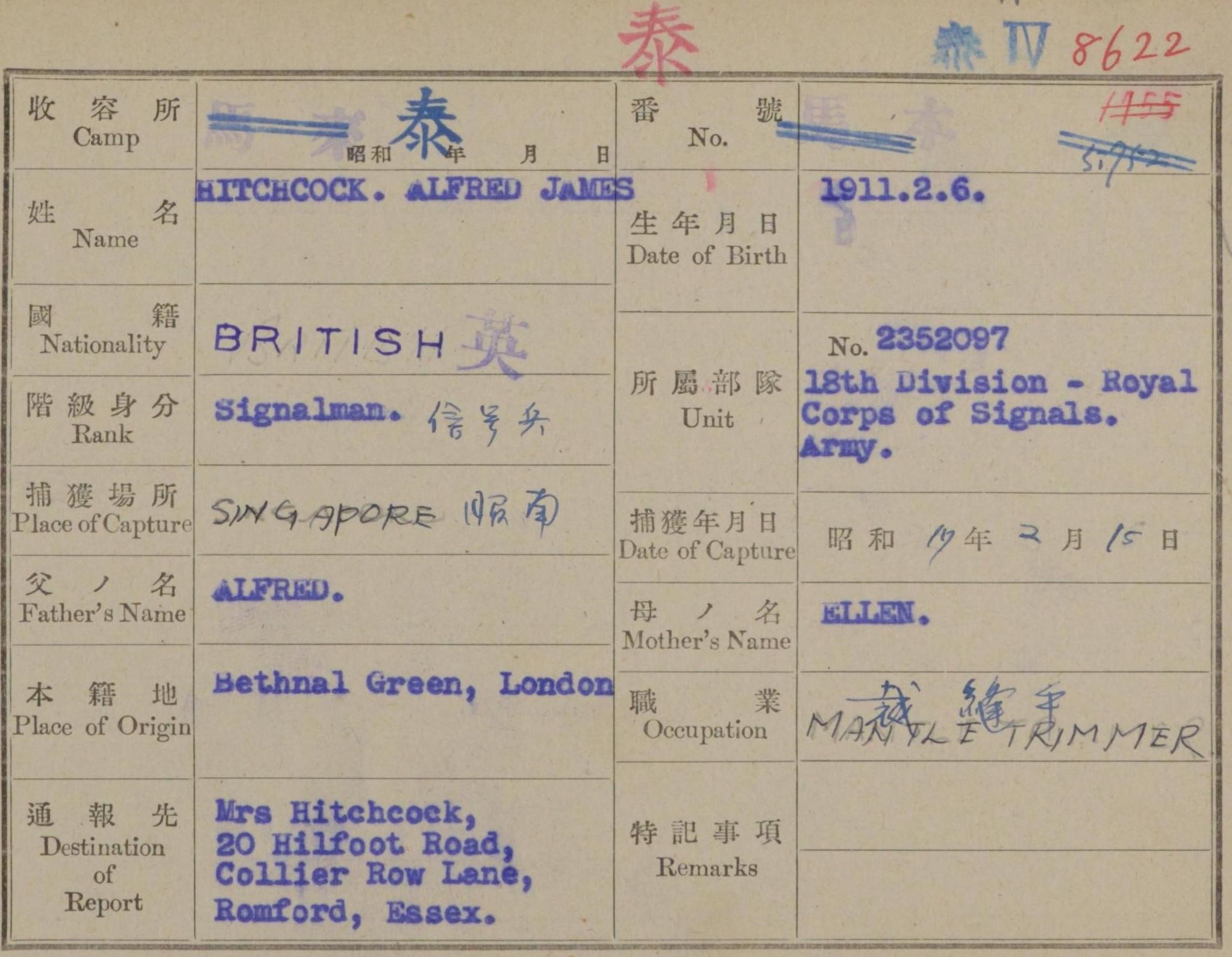 Throughout his life, he lived at 50 Corfield Street in Bethnal Green on Apr 2, 19111; and on 20 Hillfoot Road, Romford, London, England on Sep 29, 19392. During 1942, he was serving in the military in Singapore (rank: Signalman POW in Thailand).