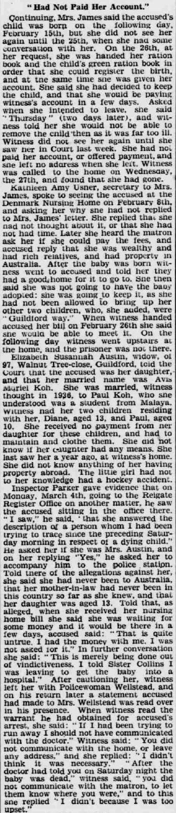 Avis Austin, (also known as Diana Austin) the third cousin once-removed on the father's side of Nigel Horne, was born in Chartham, Kent, England on Oct 28, 19081,2, was baptized there on Nov 29, 1908 was married 3 times - to Khim Kok (c. Aug 1936 in Kensington, London, England) Dennis Willcox Wan Liem3. She had 6 children: Dianne and Gillian Cara with unknown father, and 4 surviving children.