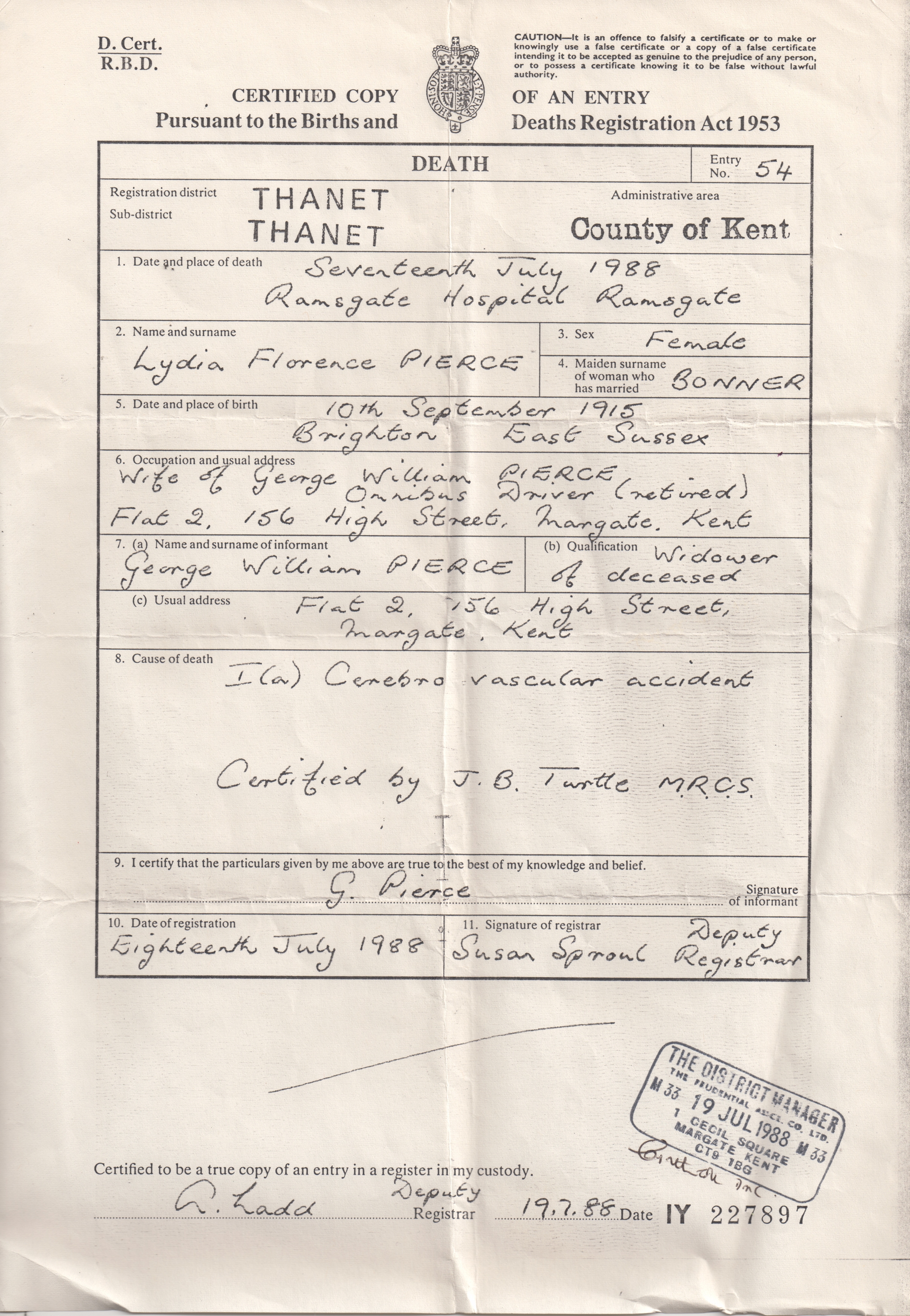She died on Jul 17, 1988 at Ramsgate Hospital, Ramsgate, Kent (cerebrovascular incident) and was buried at Margate Cemetery, Margate, Kent after Jul 17, 1988.