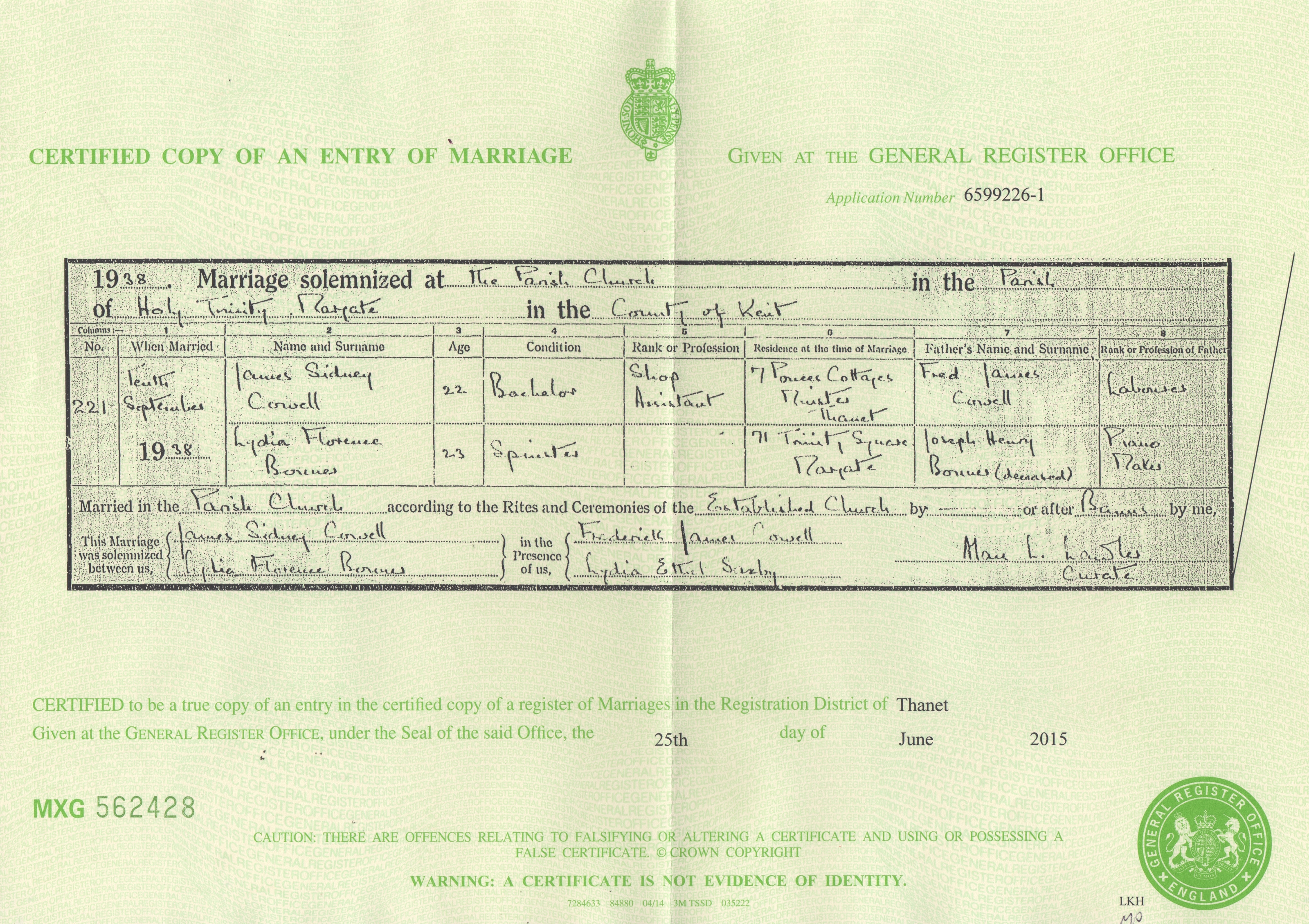 James Sidney Cowell - Lydia Florence Bonner - marriage certificate