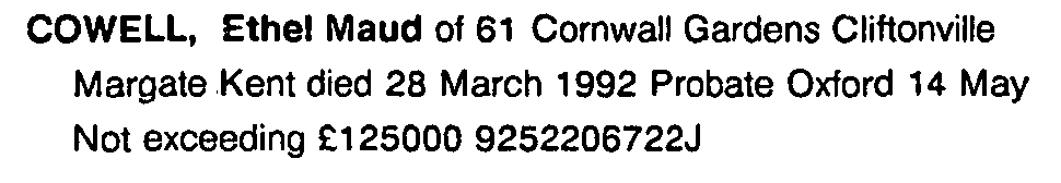 She died on Mar 28, 1992 at 61 Cornwall Gardens, Cliftonville, Kent3,5.