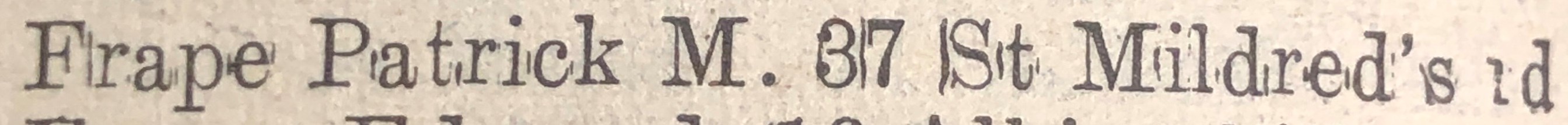 Throughout his life, Patrick lived in several places: in Ashford, Kent in 1956; on 37 St Mildred's Road, Ramsgate, Kent in 19745; and at 38 Derwent Avenue, Ramsgate, Kent in 20034.