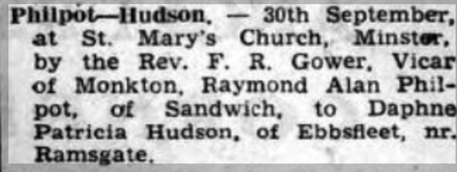 Daphne Hudson, a cousin on the mother's side of Nigel Horne, was born in Thanet, Kent, England c. Aug 19281,2. She married Raymond Philpott (with whom she had 1 surviving child) at St Mary the Virgin Church, Minster in Thanet on Sep 30, 19503. In 2003, she lived on 3 Ash Road, Sandwich, Kent, England.