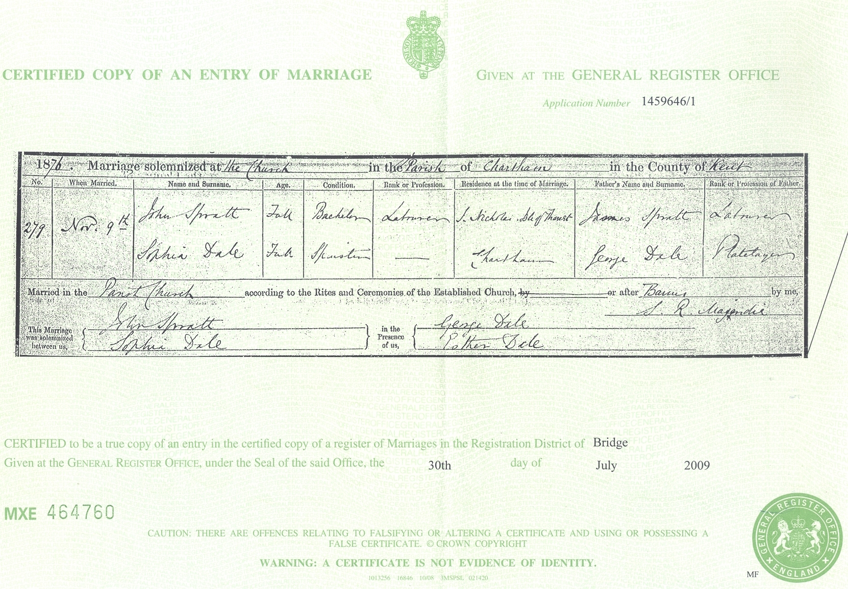 John Spratt - Sophia Dale - marriage cert