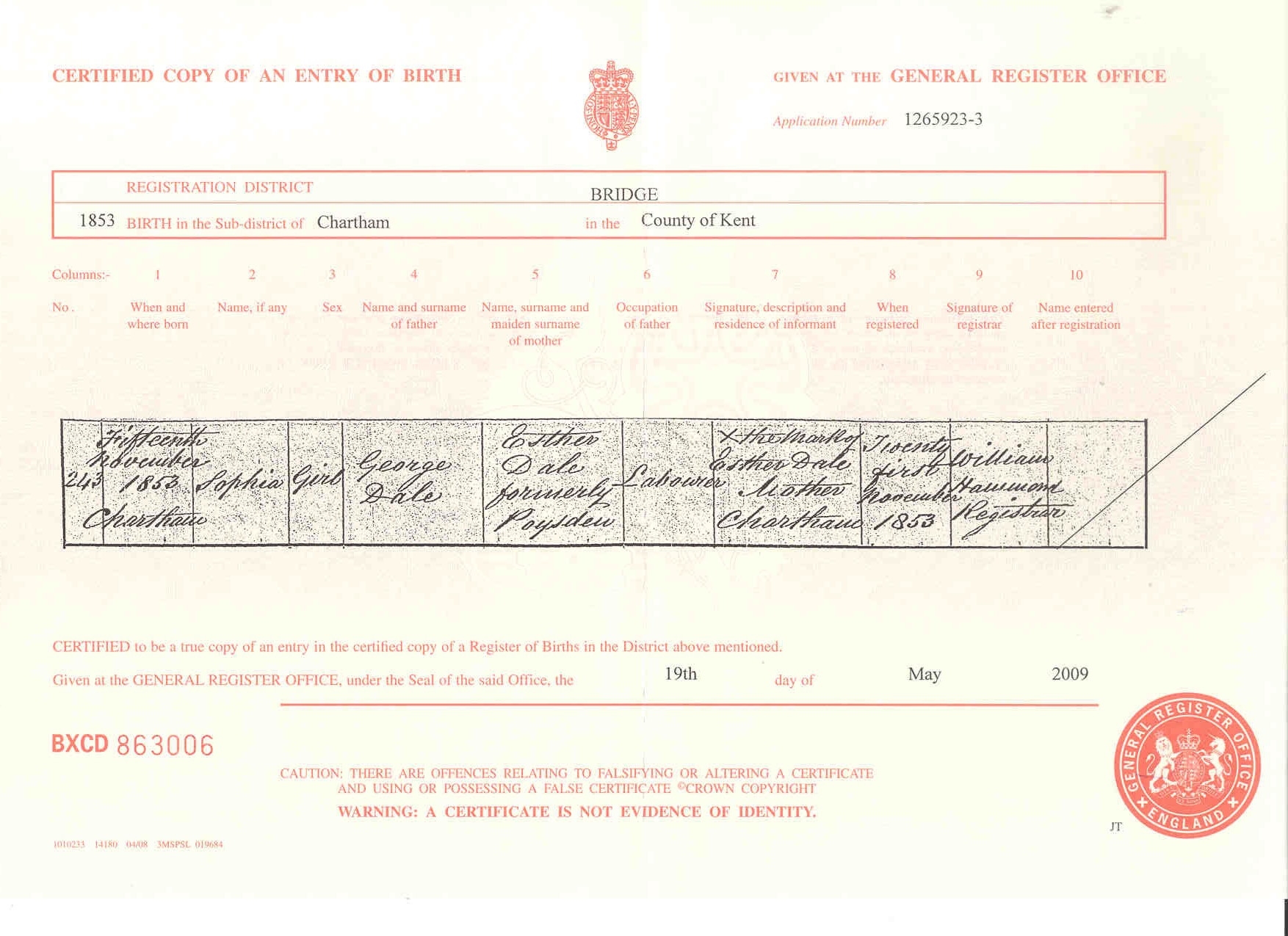Sophia Dale - Birth Certificate