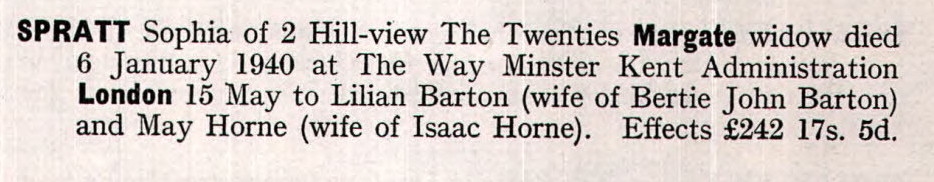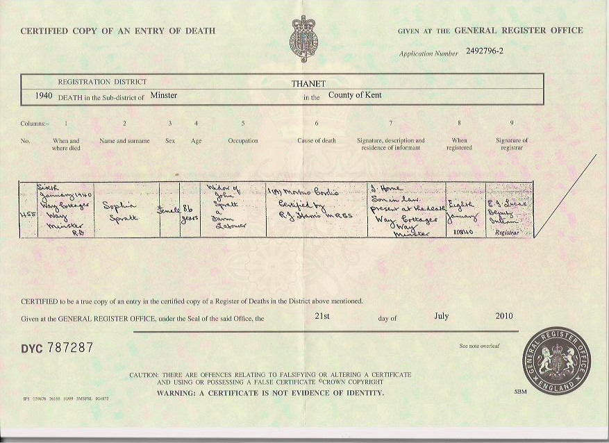 Sophia spent all of her life in Kent, England. Throughout her life, she lived in several places around the county: in Chartham Hatch, Kent, England on Apr 7, 186115; at Tonford Farm, Thanington in 18712; at The Street, St Nicholas-at-Wade on Apr 3, 188112; at Shuart Cottage, Podden Street, St Nicholas-at-Wade on Apr 5, 189113; on 2 Nash Court Cottage, Nash Road, Margate on Mar 31, 190111 and on Apr 2, 191116; at Nash Court Farm Cottage, Margate on Jun 19, 192117; and at Way Cottages, Minster, Thanet on Sep 29, 193914, when she was living with her daughter May following the death of her husband on Aug 4, 1928 which is where she died on Jan 6, 19408,9 (morbus Cordis (i.e. reason unknown - likely heart failure due to old age)).