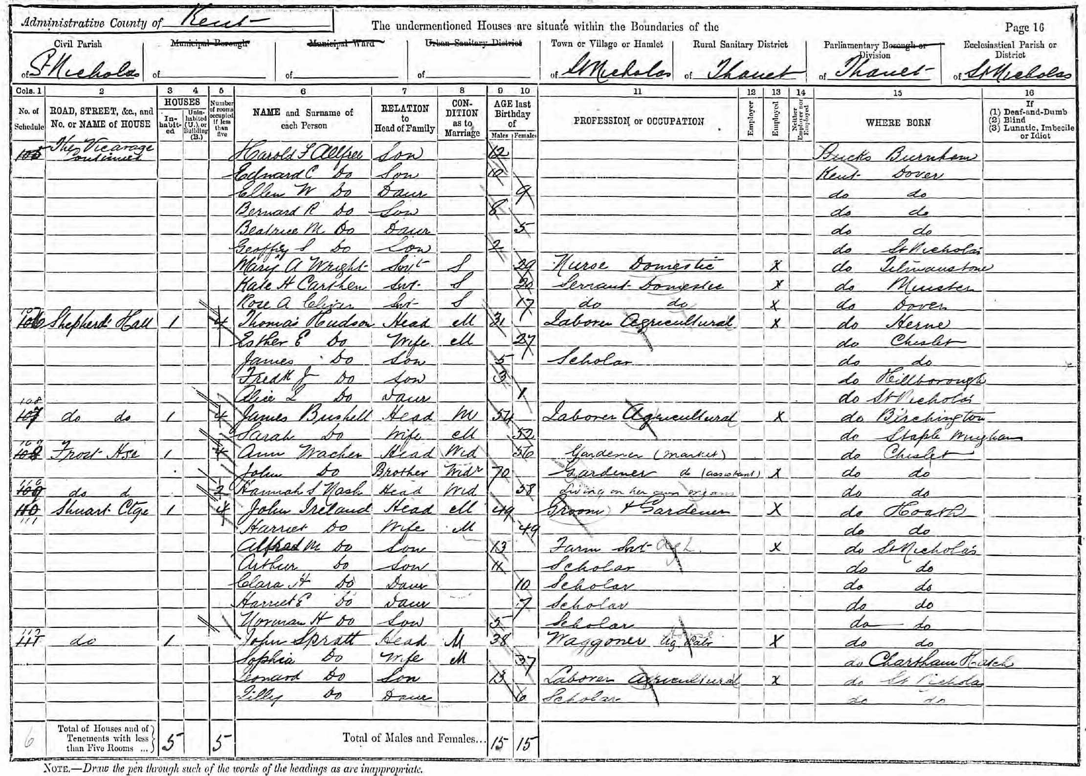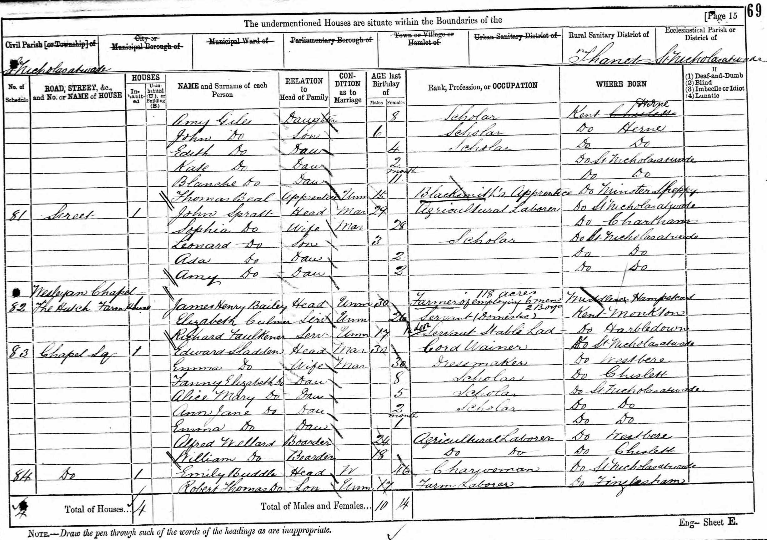 Sophia Dale, the great-grandmother of Nigel Horne, was born in Chartham, Kent, England on Nov 15, 18531,2,3,4,5,6,7, was baptized there at St Mary's Church on Jan 1, 1854 and also married John Spratt (an agricultural laborer with whom she had 11 children: Leonard, Ada, Ernest, Lillian, May, Harry Dale, George Dale, Ida, Hilda, Ella and Reuben) there at St Mary's Church, on Nov 9, 187610 (Rev Randolph, St Marys).