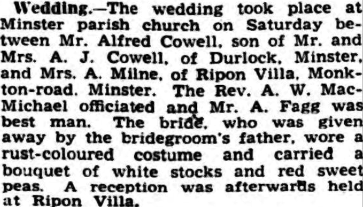 Alfred Cowell, (also known as Chib Cowell) the first cousin once-removed on the mother's side of Nigel Horne, was born in Minster, Thanet, Kent, England on Sep 24, 19131,2,3,4,5 and. He was married twice - to Ada Milne (on Jun 13, 1942 in Minster) Mary Williams (c. Feb 1951 in Thanet, Kent, England)6. He has 2 surviving children, both with Mary Williams: Nina J and Richard.