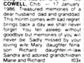 [ Home ] | [ Calendar ] | [ Surnames Index ] | [ Family History ]An agricultural laborer and the son of Alfred Cowell (a transport driver) and Fanny Austen,