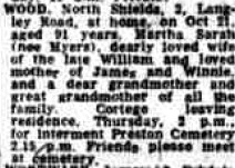 Martha Myers was born in Sunderland, Durham, England on Jun 27, 18831,2,3 and married William Wood (a plasterer with whom she had 5 children: William Henry, Martha Sarah, James, Hilda and Wilhelmina, along with 1 surviving child) in Tynemouth, Tyne and Wear, England around Nov 19074.