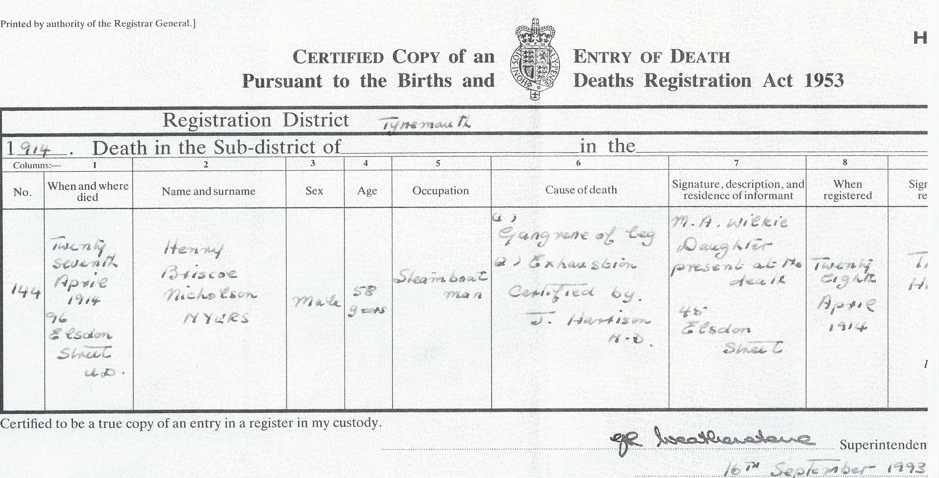 Throughout his life, Henry lived in several places: at North Street, North Shields, Tyne and Wear on Apr 7, 186111; at 2 South Street, North Shields, Tyne and Wear on Apr 3, 18819; at 16 Appleby Street, North Shields, Tyne and Wear on Apr 5, 18911; at 48 Appleby Street, North Shields, Tyne and Wear on Mar 31, 19018; and at 96 Elsdon Street in Tynemouth on Apr 2, 191110, when he was living with his daughter Henrietta Briscoe Nicholson following the death of his wife on Mar 11, 1910 which is where he died on Apr 27, 19146.
