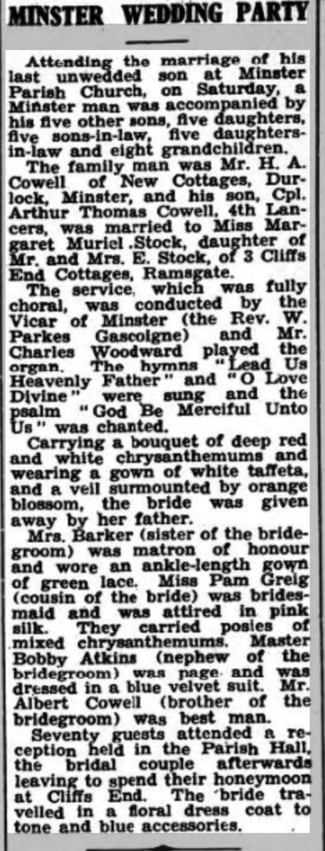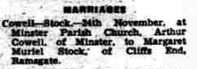 Arthur Cowell, the first cousin once-removed on the mother's side of Nigel Horne, was born in Thanet, Kent, England on Jul 14, 19231,2,3 and. He married Margaret Stock (with whom he had 1 surviving child) at St Mary the Virgin Church, Minster in Thanet on Nov 24, 19454.