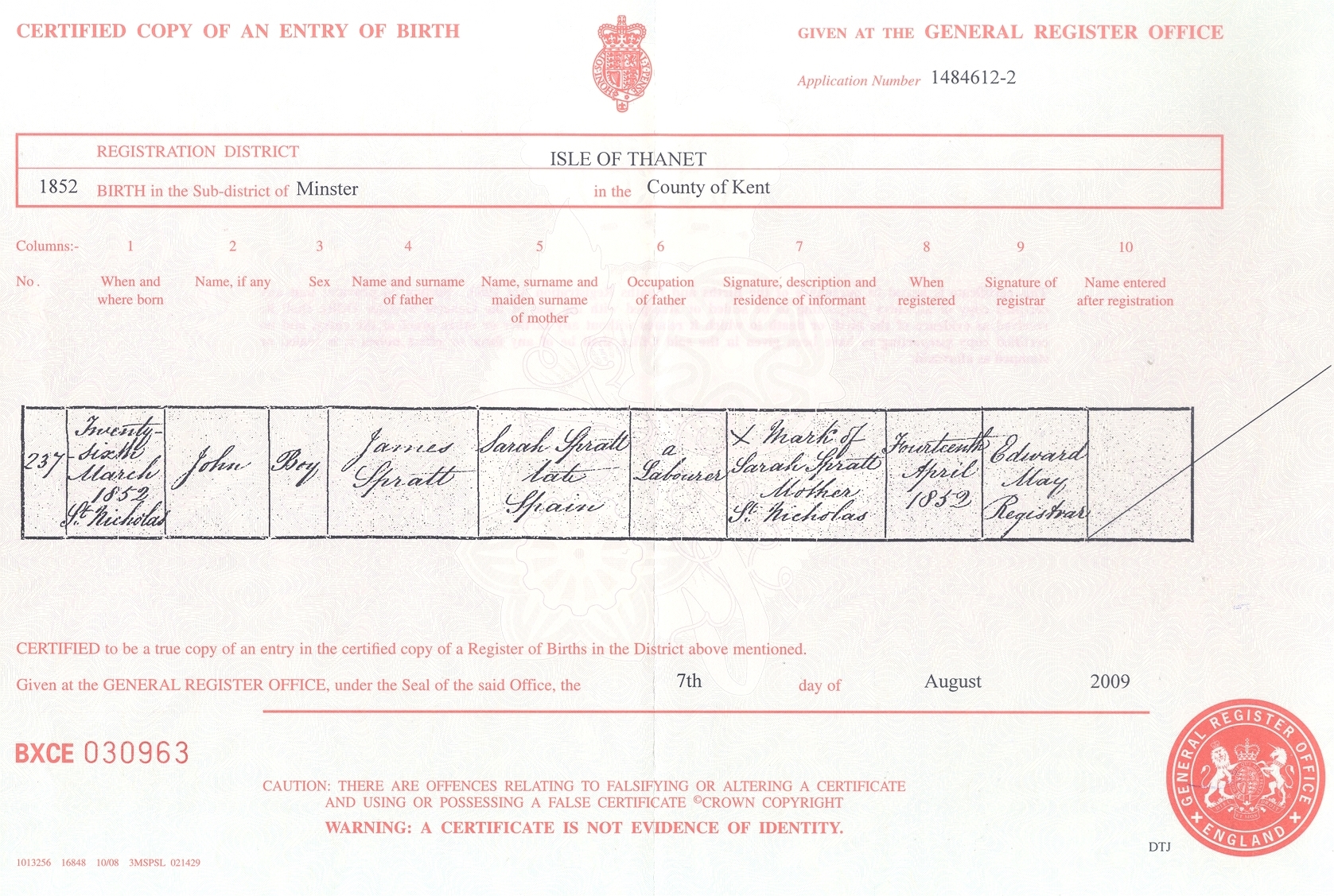 John Spratt, the great-grandfather of Nigel Horne, was born in St Nicholas-at-Wade, Kent, England on Mar 26, 18521,2,3,4,5,6,7,8, was baptized there on Apr 25, 1852 and married Sophia Dale (with whom he had 11 children: Leonard, Ada, Ernest, Lillian, May, Harry Dale, George Dale, Ida, Hilda, Ella and Reuben) at St Mary's Church, Chartham, Kent, England on Nov 9, 187611 (Rev Randolph, St Marys). He also had 1 child, Amy, whose mother is unknown. Like his father, he was an agricultural laborer.