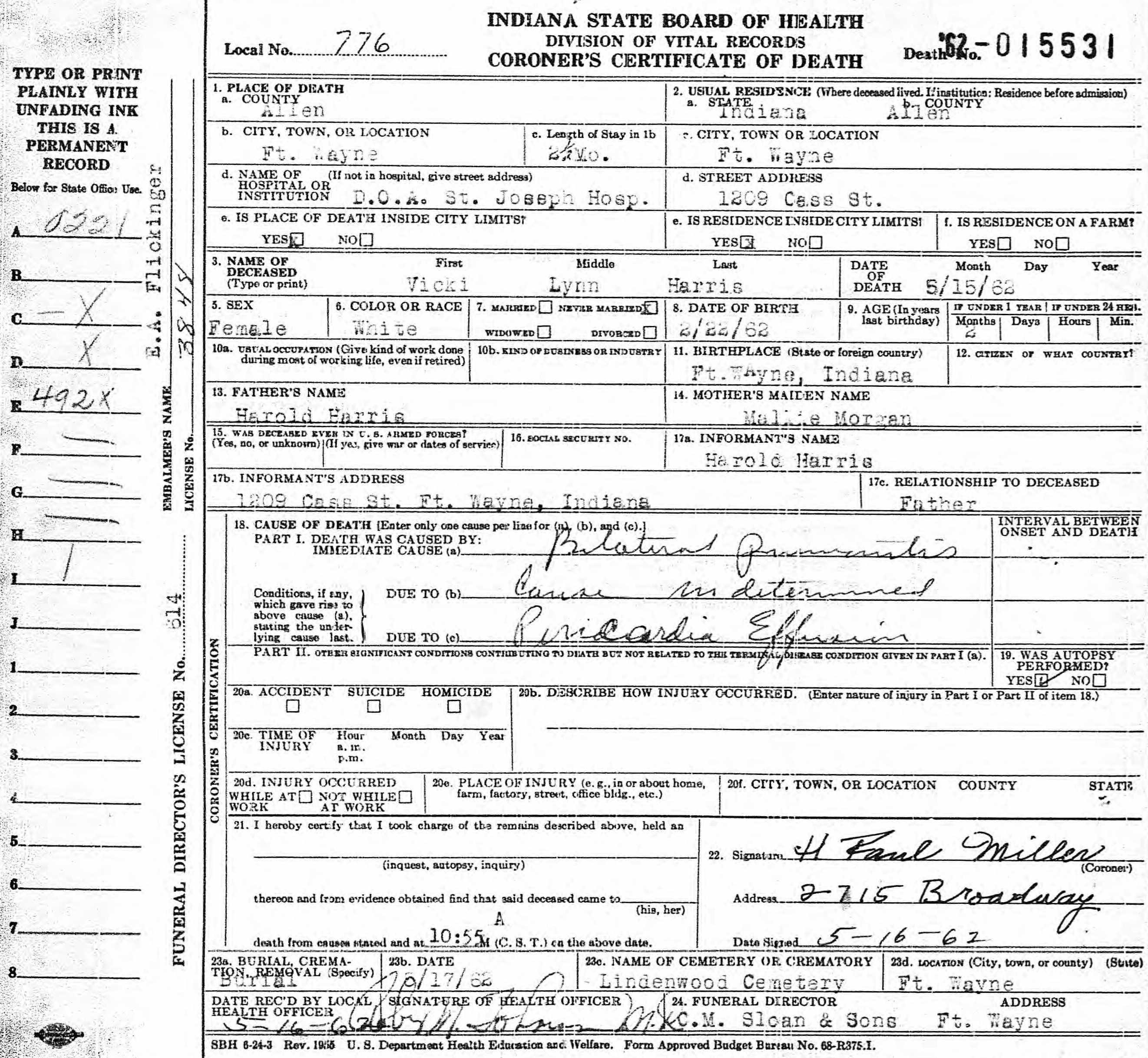 Vicki Harris, the sixth cousin on the mother's side of Nigel Horne, was born in Fort Wayne, Allen, Indiana, USA on Feb 22, 1962.