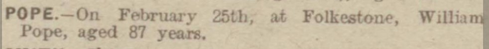 He died on Feb 25, 1915 at 13 Marine Crescent in Folkestone3,4,5 and was buried at Cheriton Road Cemetery, Folkestone on Feb 27, 1915.