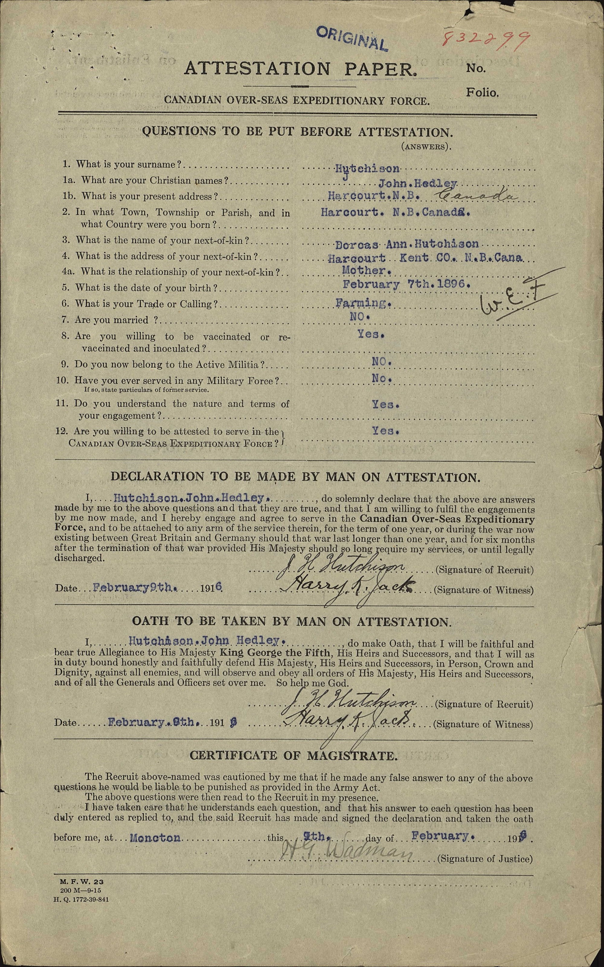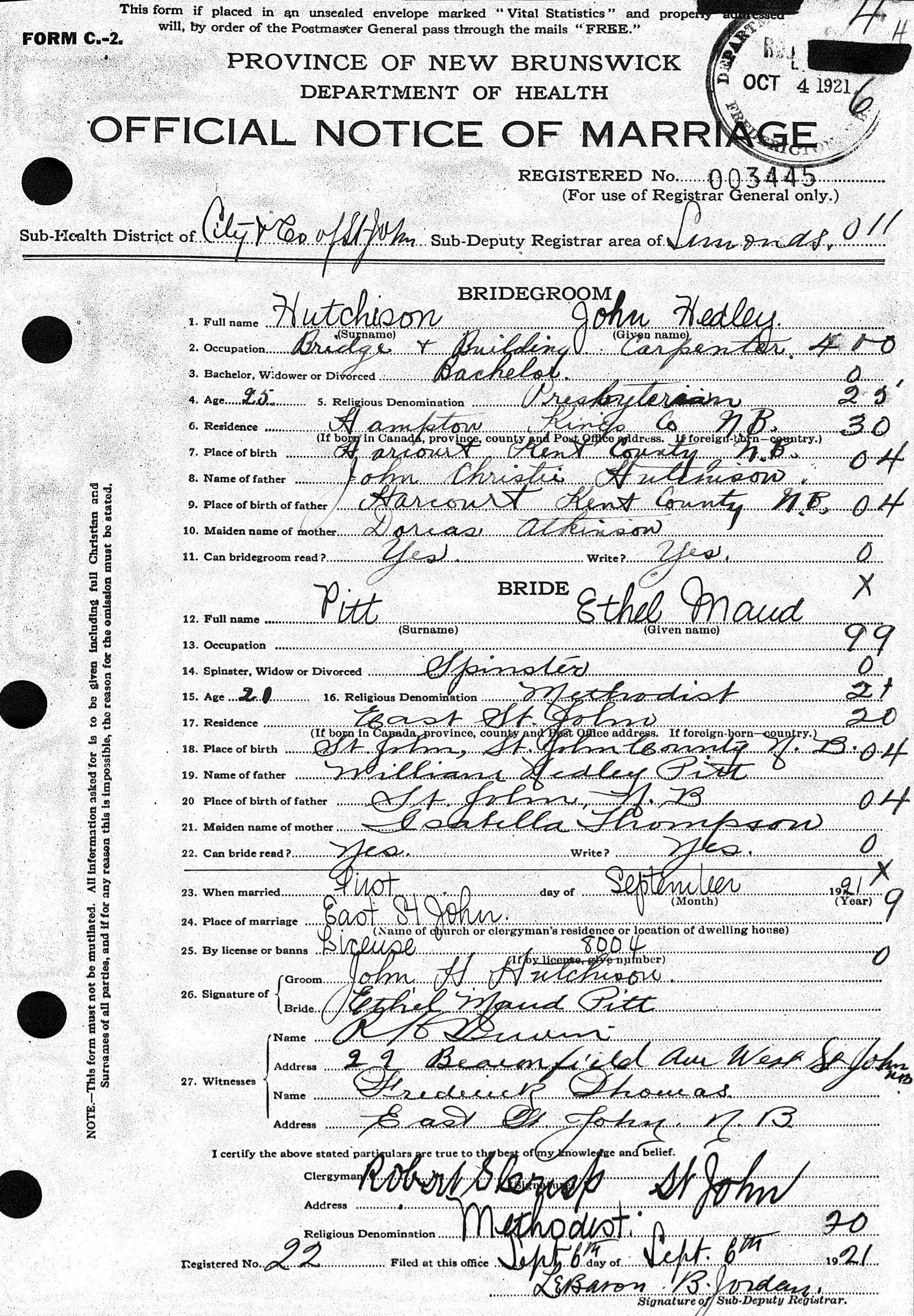 John Hutchison, the fourth cousin once-removed on the father's side of Nigel Horne, was born in Harcourt, Kent, New Brunswick, Canada on Feb 7, 18961 and married Ethel Pitt (with whom he had 2 children: Dorothy and Everett Hedley, along with 1 surviving child) in St John, New Brunswick, Canada on Sep 1, 1921.