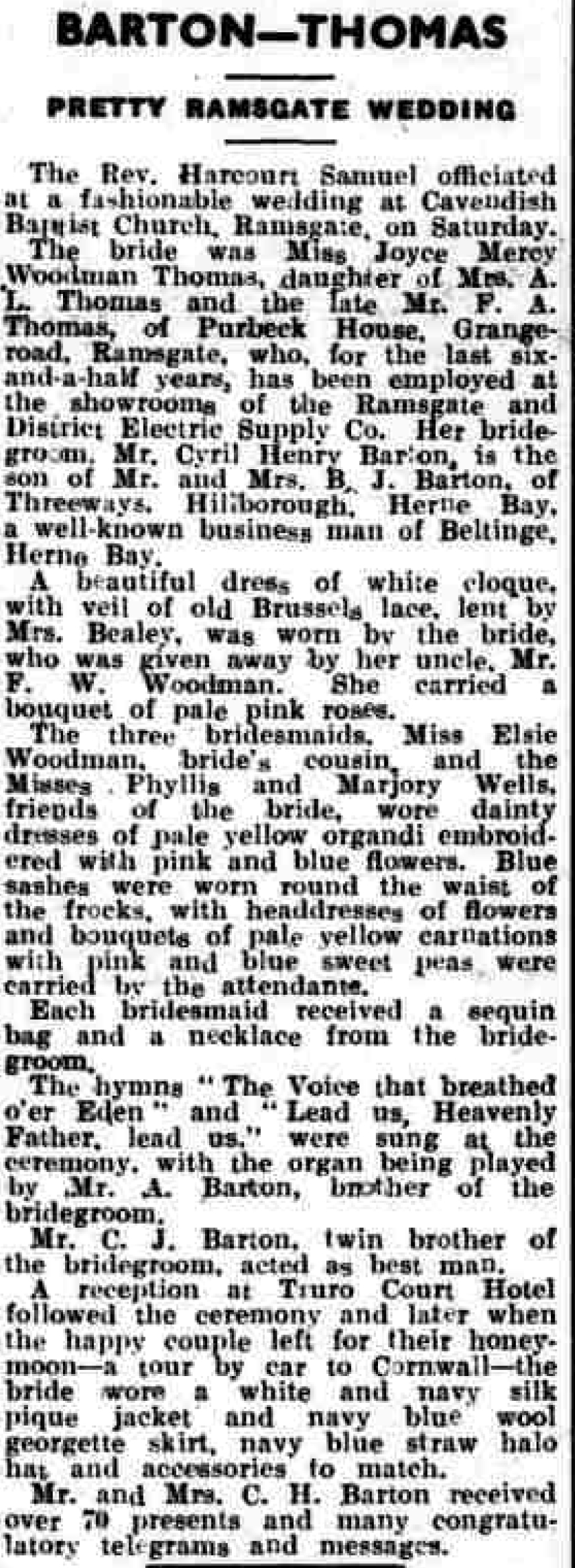 Cyril Barton, the first cousin once-removed on the father's side of Nigel Horne, was born in Blean, Kent, England on Sep 6, 19141,2,3,4,5 along with his twin brother Cecil John. He married Joyce Thomas at Cavendish Baptist Church, Cavendish Street, Ramsgate, Kent, England on Jun 26, 19377.