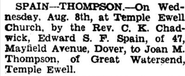 Edward Spain, the husband of Joan Marguerite Thompson (the fourth cousin on the father's side of Nigel Horne), was born in Dover, Kent, England on Apr 10, 1918 and. He married Joan (with whom he had 1 surviving child) in Temple Ewell, Kent, England on Aug 8, 19451.