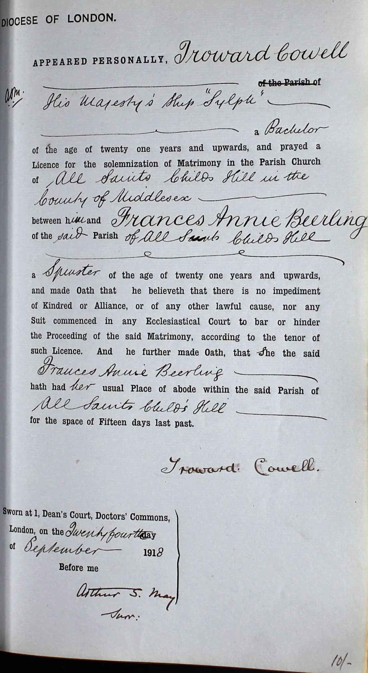Troward Cowell - Frances Beerling - Marriage Bond