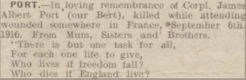James Port, the third cousin twice-removed on the mother's side of Nigel Horne, was born in Cheriton, Kent, England c. Aug 18851,2,3,4 and baptized there at St Martins Church on Sep 13, 1885.