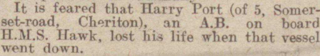 Harry Port, the third cousin twice-removed on the mother's side of Nigel Horne, was born in Herne Bay, Kent, England on May 30, 18801,2,3, was baptized in Folkestone, Kent, England on Aug 29, 1880 and married Adelaide Tamsitt (with whom he had 1 child, whose first name is unknown) in Canterbury, Kent, England around Nov 19024.