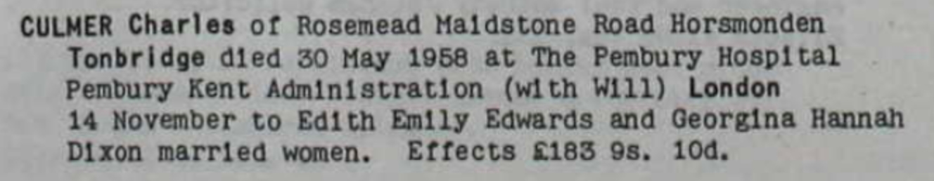 He died on May 30, 1958 on Pembury Hospital, Tonbridge Road, Pembury, Kent4.