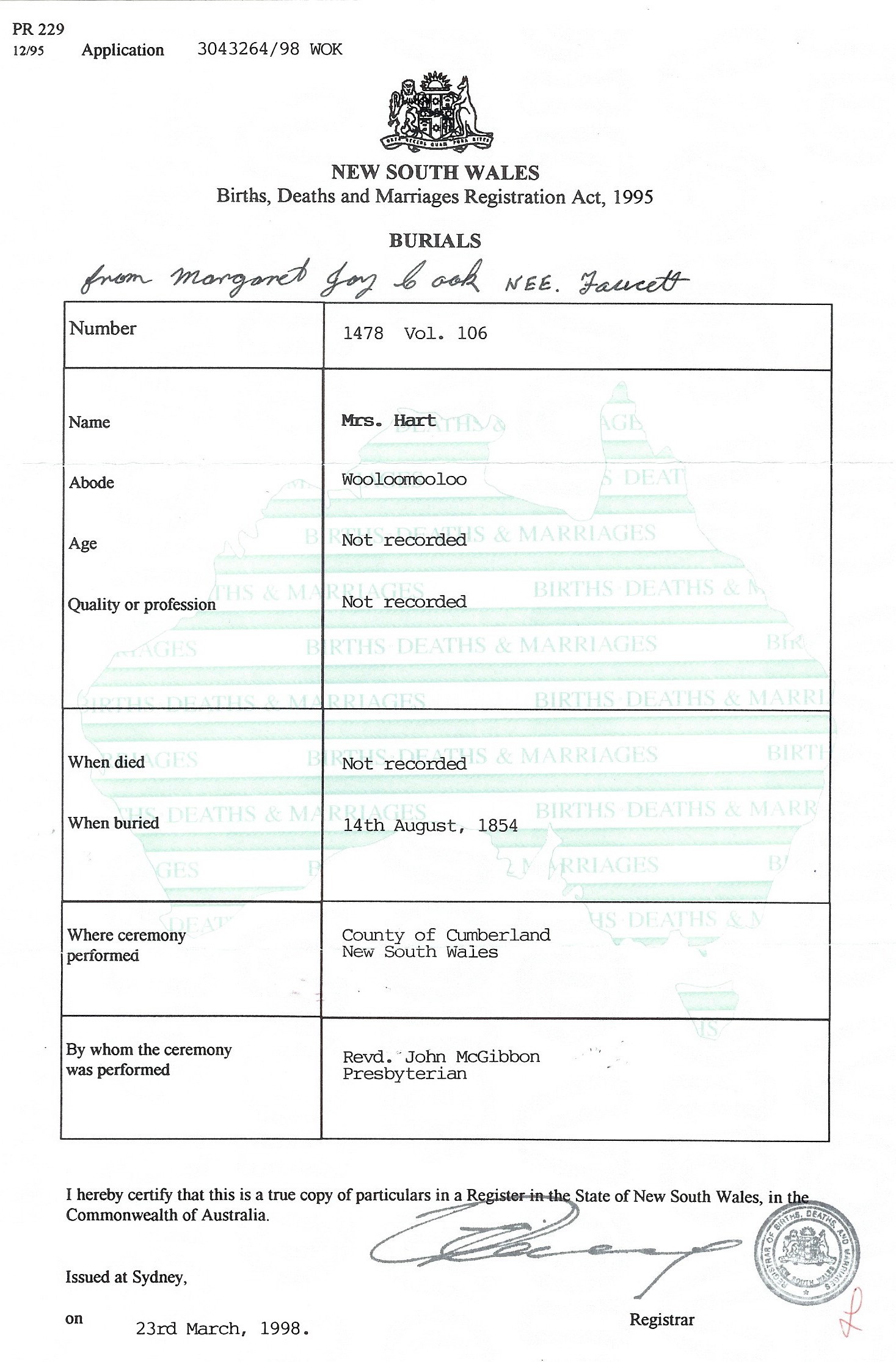 She died c. 1854 in New South Wales, Australia and was buried in Cumberland, New South Wales on Aug 14, 1854.
