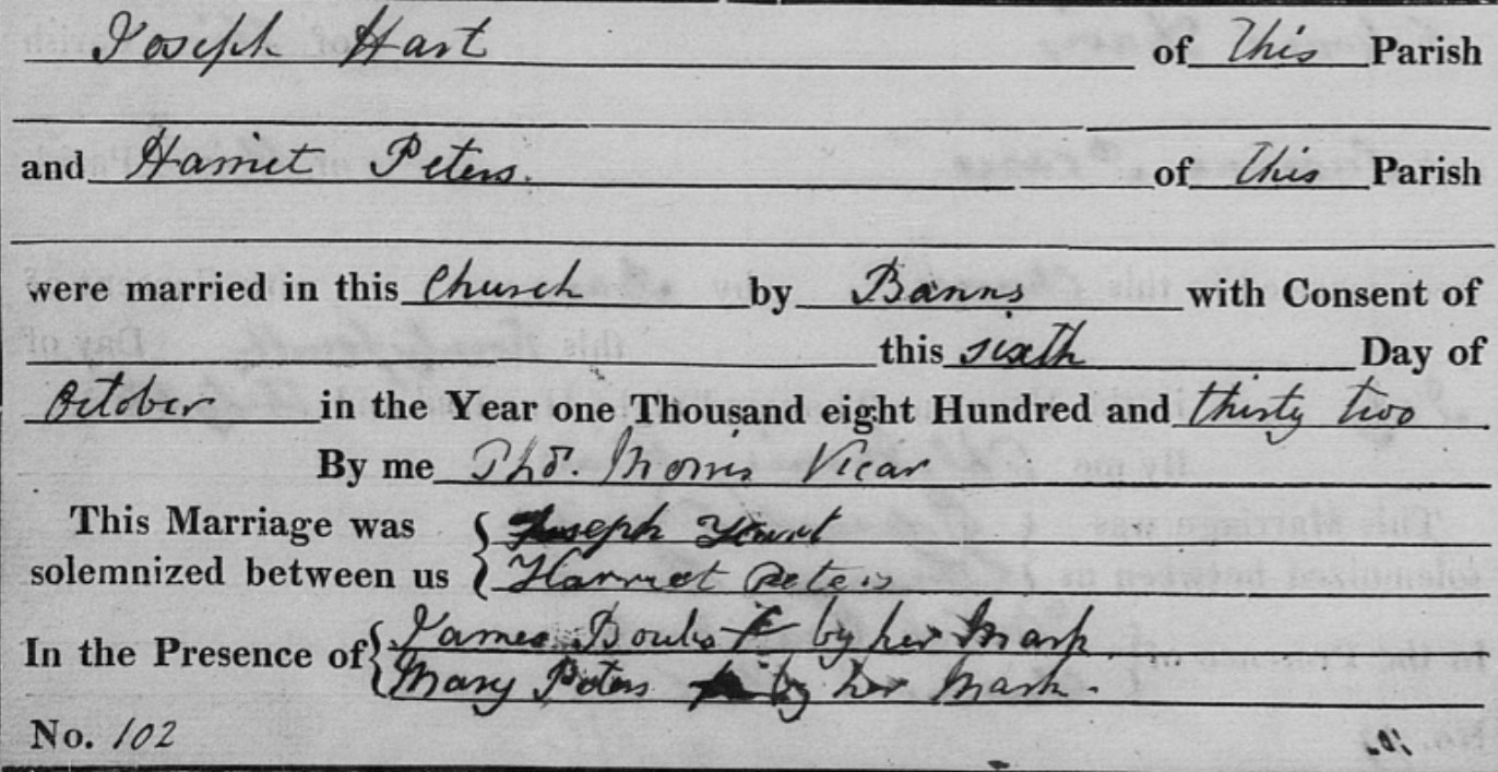 Joseph Hart, the husband of Harriet Peters (the first cousin four-times-removed on the father's side of Nigel Horne), and married Harriet (with whom he had 4 children: Henry, Sarah Anne, Jane and Elizabeth) at St Lawrence, Hougham, Kent, England on Oct 6, 18321.