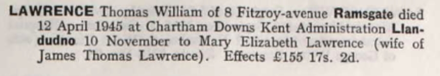 He died on Apr 12, 1945 at St Augustine's Hospital, Chartham, Kent4,5,6,7,8 (he died unmarried, leaving his estate to his mother) and was buried at Ramsgate Cemetery in Ramsgate on Apr 18, 1945 following his funeral at St Lawrence Cemetery7.