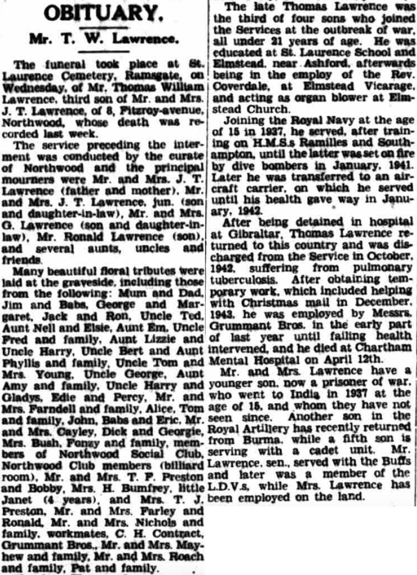 Throughout his life, he lived at Meadow Cottages in Marshside on Jun 19, 19211; and at 8 Fitzroy Avenue, Ramsgate, Kent, England in 1945. He served in the navy from 1937 to 1942 (regiment: Royal Navy; Rank: Able Seaman; Service number: C/JX 152097 HMS Eagle).