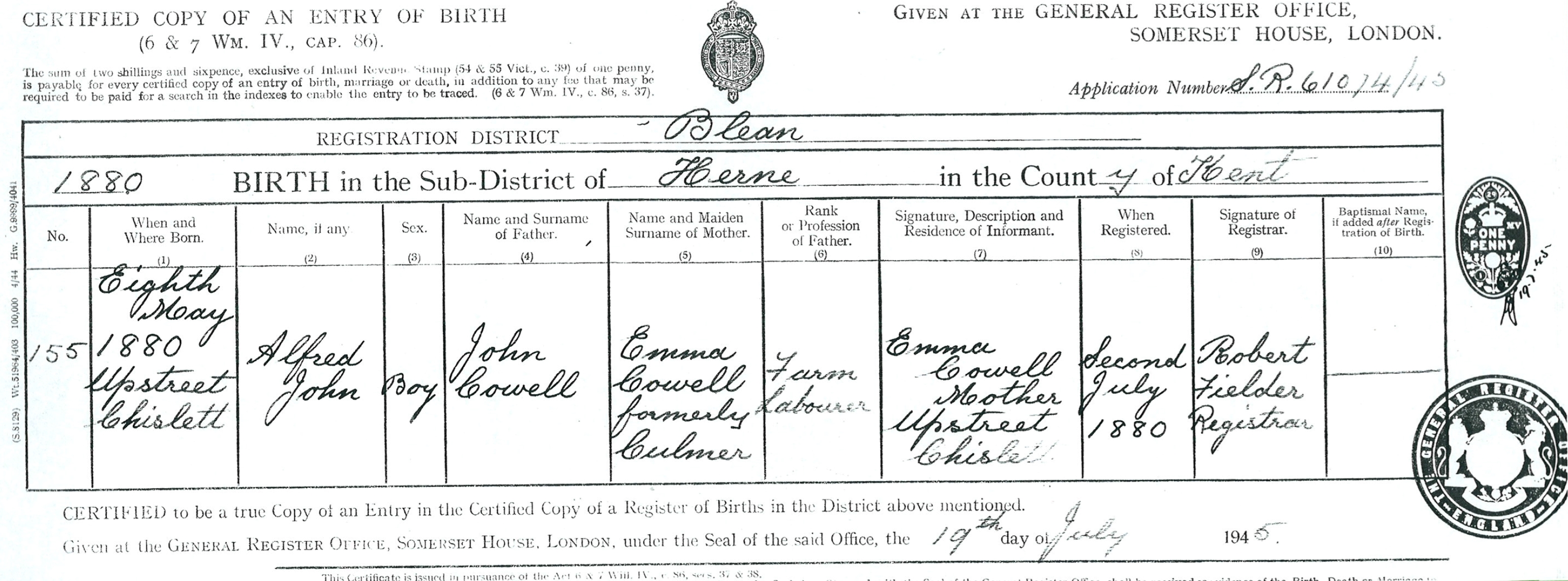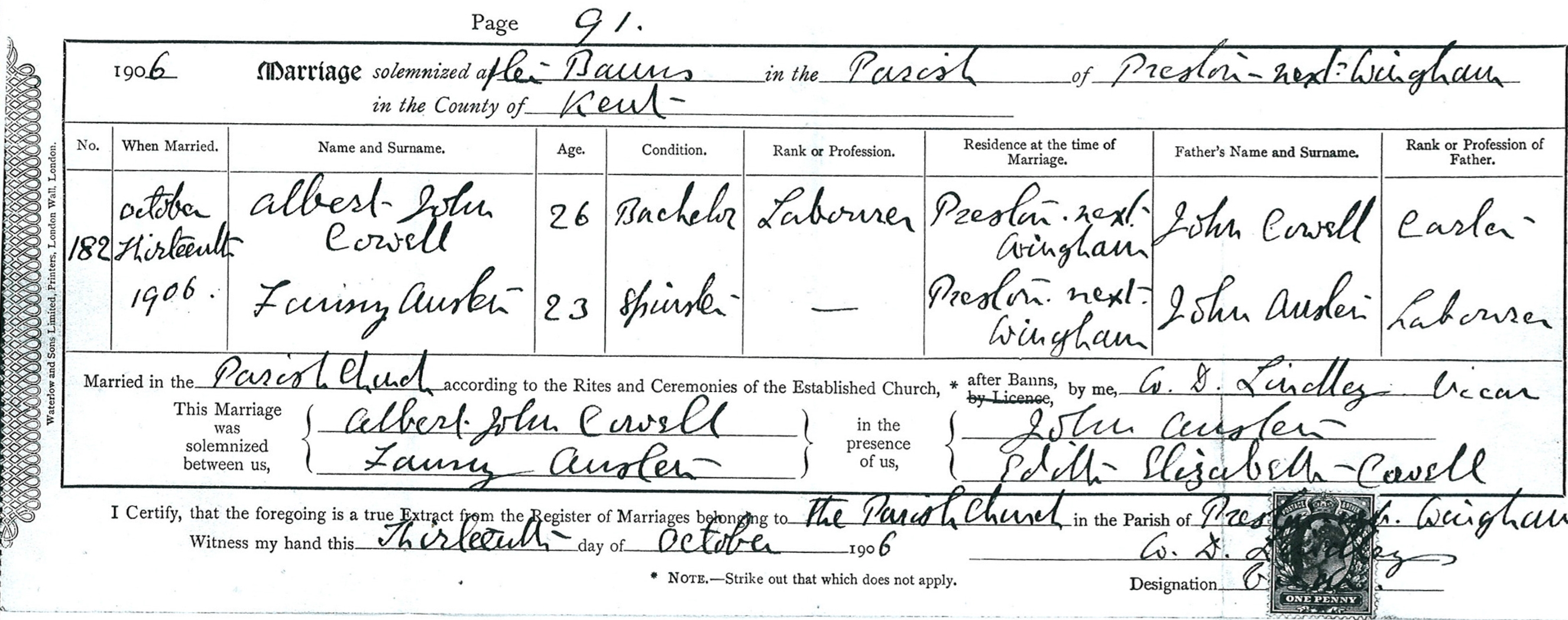 Alfred Cowell, (also known as Albert Cowell) the great-uncle of Nigel Horne, was born in Chislet, Kent, England on May 8, 18801,2,3, was baptized there at St Marys on Jun 6, 1880 and married Fanny Austen (with whom he had 11 children: William John, Edith Mary, Florence Emily, Albert Edward, Alfred, Ernest James, Annie, Winifred E, Nellie, Arthur Thomas and Daisy Ethel) at St Mildred's Church, Preston, Wingham, Kent, England on Oct 13, 19065 (St Mildreds).
