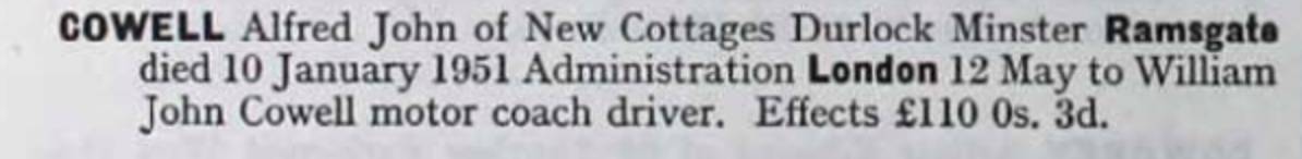 Alfred spent all of his life in Kent, England. Throughout his life, he lived in several places around the county: at Wayborough, Minster, Thanet on Apr 3, 18819; in Upstreet on Apr 5, 18918; at Brewery Cottages, Upper Stourmouth on Apr 2, 19117; at Durlock Farm Cottages, Minster, Thanet on Jun 19, 192110; and in Durlock, Minster, Thanet in 19356, in 1936 and on Sep 29, 1939 following the death of his wife on Jul 28, 1935. Alfred In 1921 he was working at W Pearce (Farmer) at Durlock, Minster, Thanet, Kent, England.