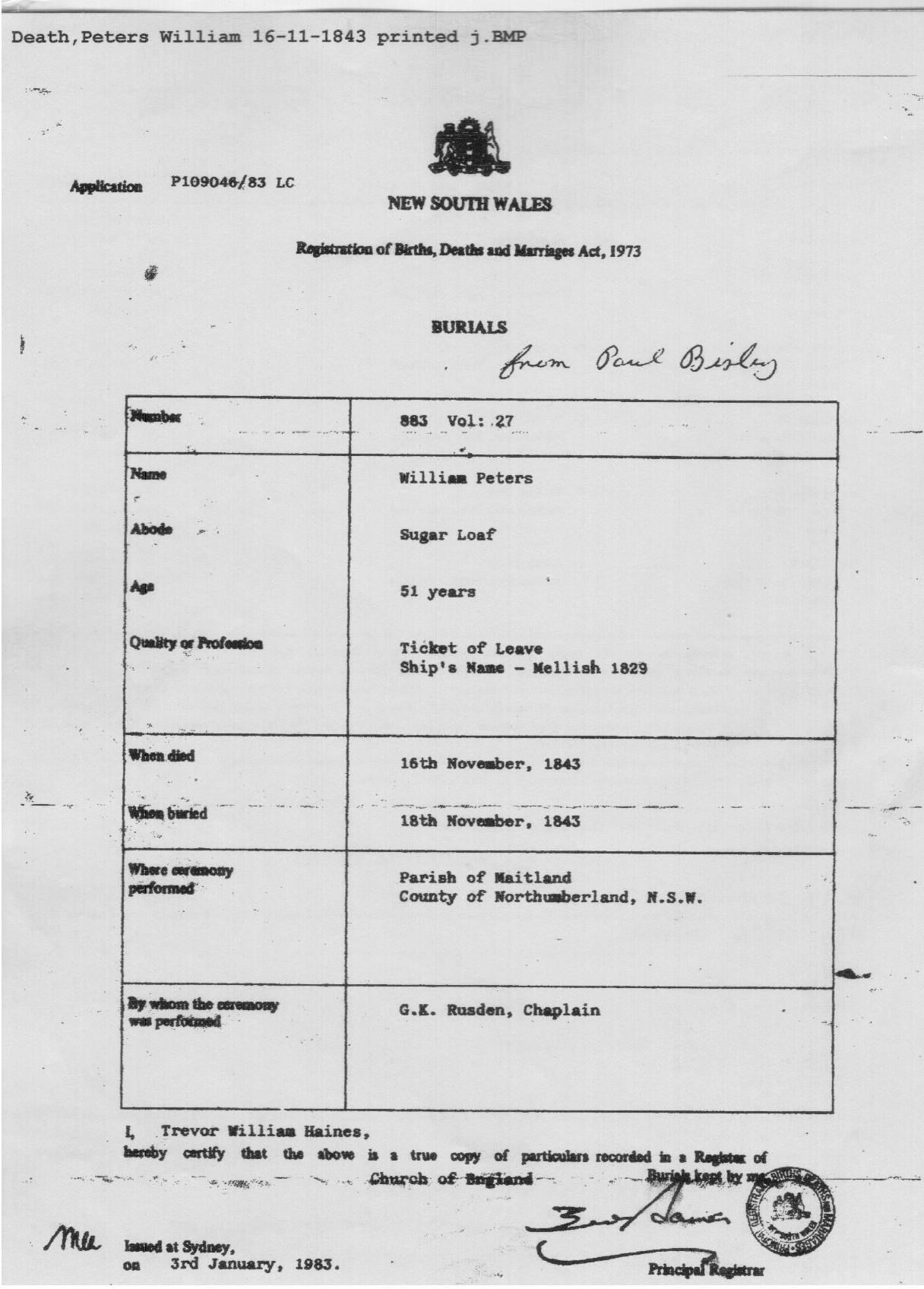 He died on Nov 14, 1843 in Maitland, New South Wales, Australia6,7,8,9 and was buried Glebe Cemetery in Maitland on Nov 18, 18436.