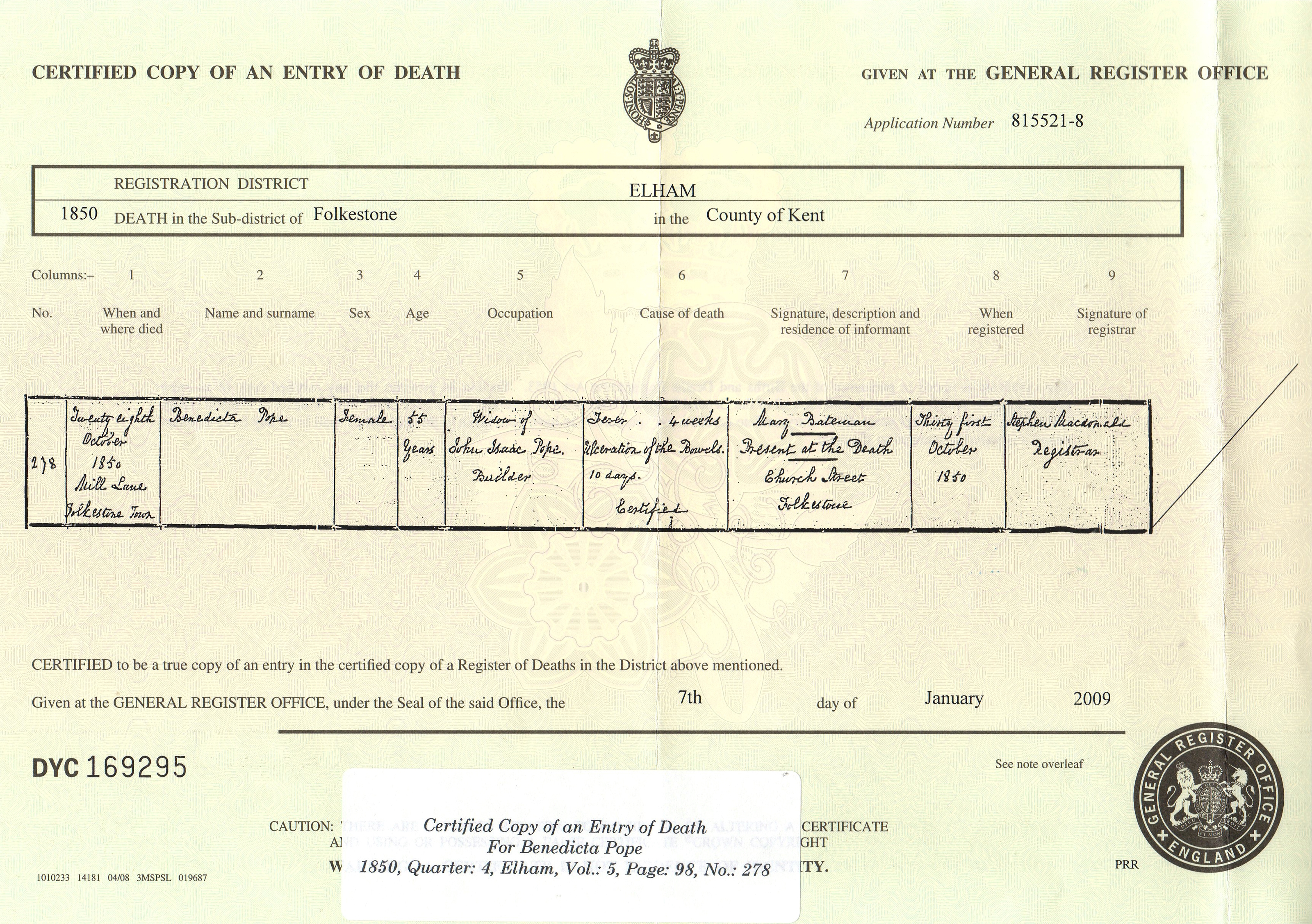 She died on Oct 28, 1850 on Mill Lane in Folkestone3,5 (ulceration of the bowels) and was buried at Parish Church of St Mary & St Eanswythe, Church Street, Folkestone on Nov 2, 18503,7,8,9.