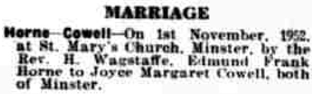 Edmund Horne, the father of Nigel Horne, was born in Minster, Thanet, Kent, England on Sep 3, 19191,2,3,4,5,6,7 and married Joyce Cowell (with whom he had 4 children: David James, Diane Joyce, Nigel John and David James, along with 1 surviving child) at St Mary the Virgin Church, Minster, Thanet, Kent, England on Nov 1, 19528.