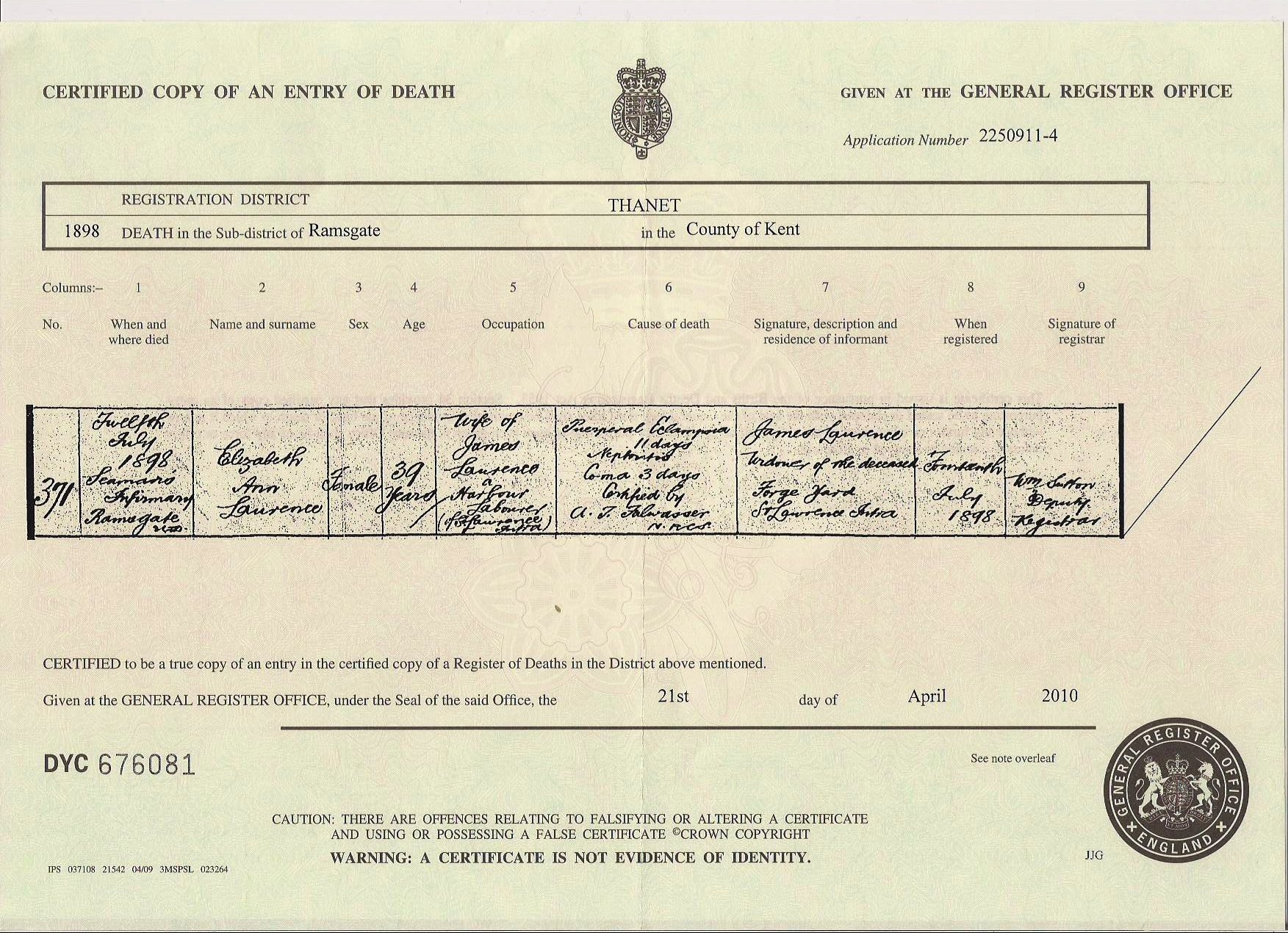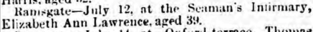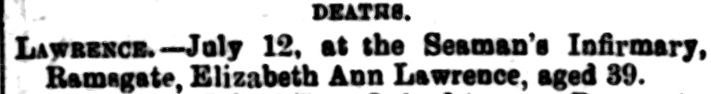 She died on Jul 12, 1898 on Seaman's Infirmary, West Cliff Road in Ramsgate5,6 (pre-eclampsia followed by a coma).