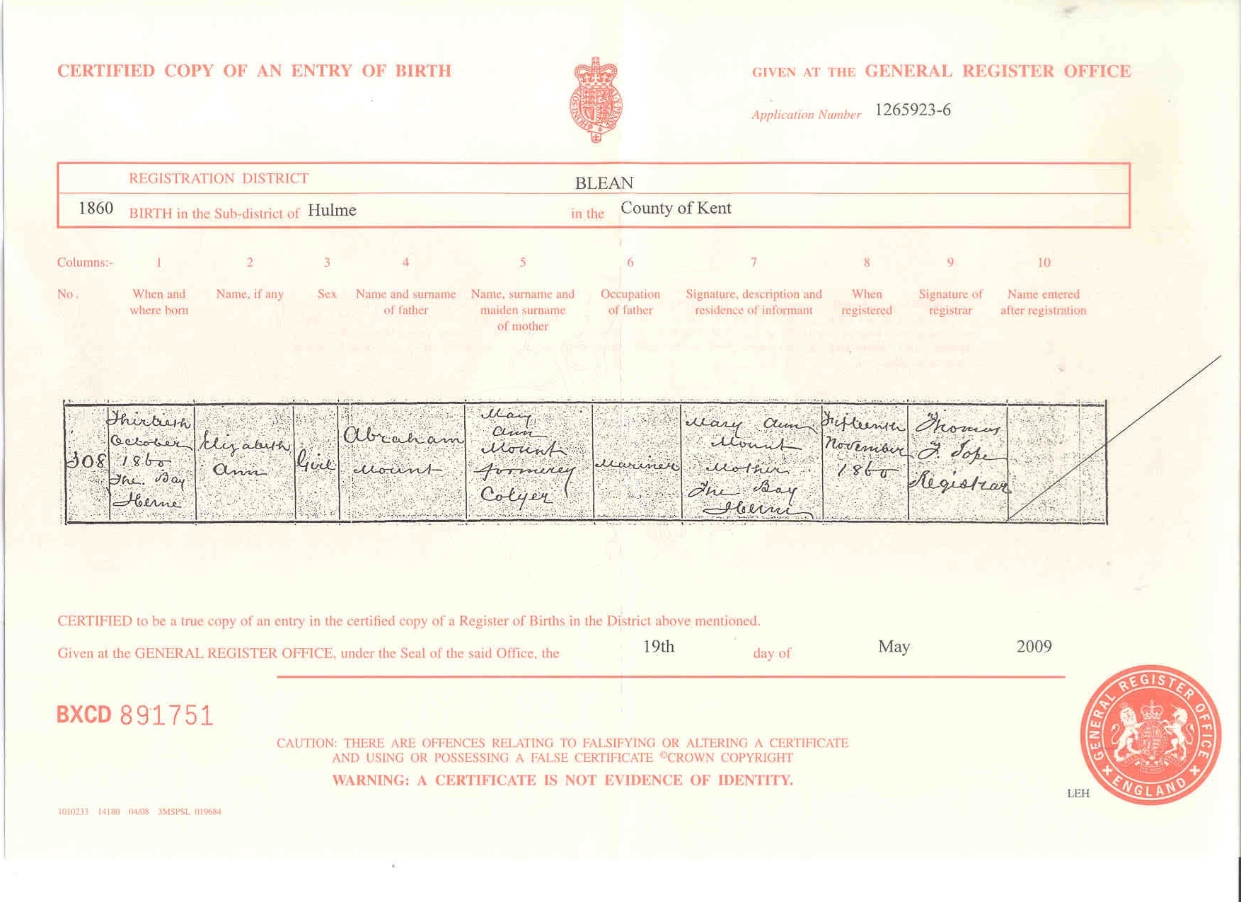 Elizabeth Mount, the great-grandmother of Nigel Horne, was born in Herne Bay, Kent, England on Oct 13, 18601,2,3,4,5, was baptized there at Christ Church on Nov 25, 1860 and married James Lawrence (an agricultural laborer with whom she had 6 children: Edward James S, William John, Emily Jane, Walter Charles, Elizabeth Annie and James Thomas) at Ebenezer Chapel, Meeting Street, Ramsgate, Kent, England on Dec 10, 18827.