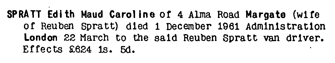 [ Home ] | [ Calendar ] | [ Surnames Index ] | [ Family History ]Edith Green, the wife of Reuben Spratt (the great-uncle of Nigel Horne), was born in Marylebone, London, England on Dec 31, 18961,2,3 and married Reuben (an agricultural laborer with whom she had 3 children: Reuben A, Derek John and Evelyn Maud) in Thanet, Kent, England around Nov 19245.