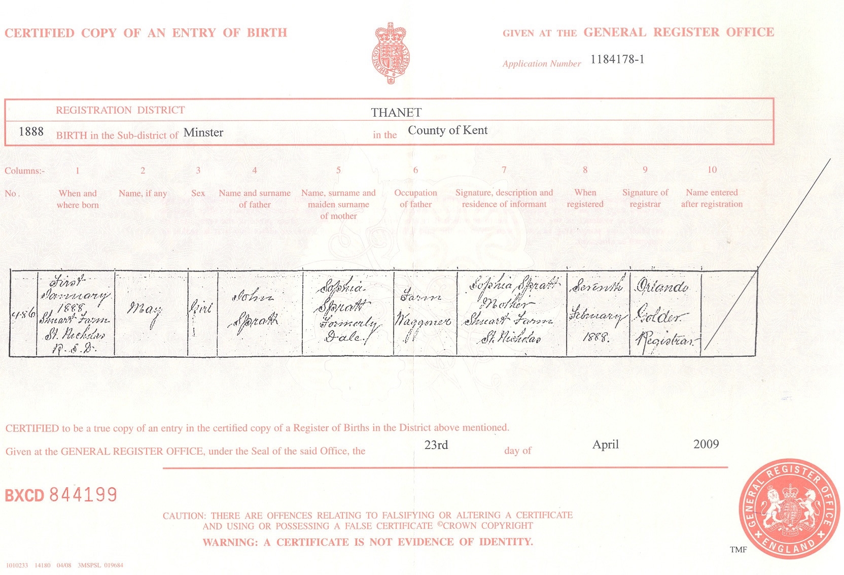 May Spratt, the grandmother of Nigel Horne, was born in St Nicholas-at-Wade, Kent, England in 18881,2,3,4,5,6,7, was baptized there on Feb 29, 1888 and married Isaac Horne (a hay trusser & thatcher heavy worker market gardener with whom she had 7 children: Isaac George, Ernest John, Gladys Jane, Wilfred George, Edmund Frank, Frederick Norman and Ronald Leonard) at All Saints Church, Westbrook, Margate, Kent, England on Jul 2, 19109.