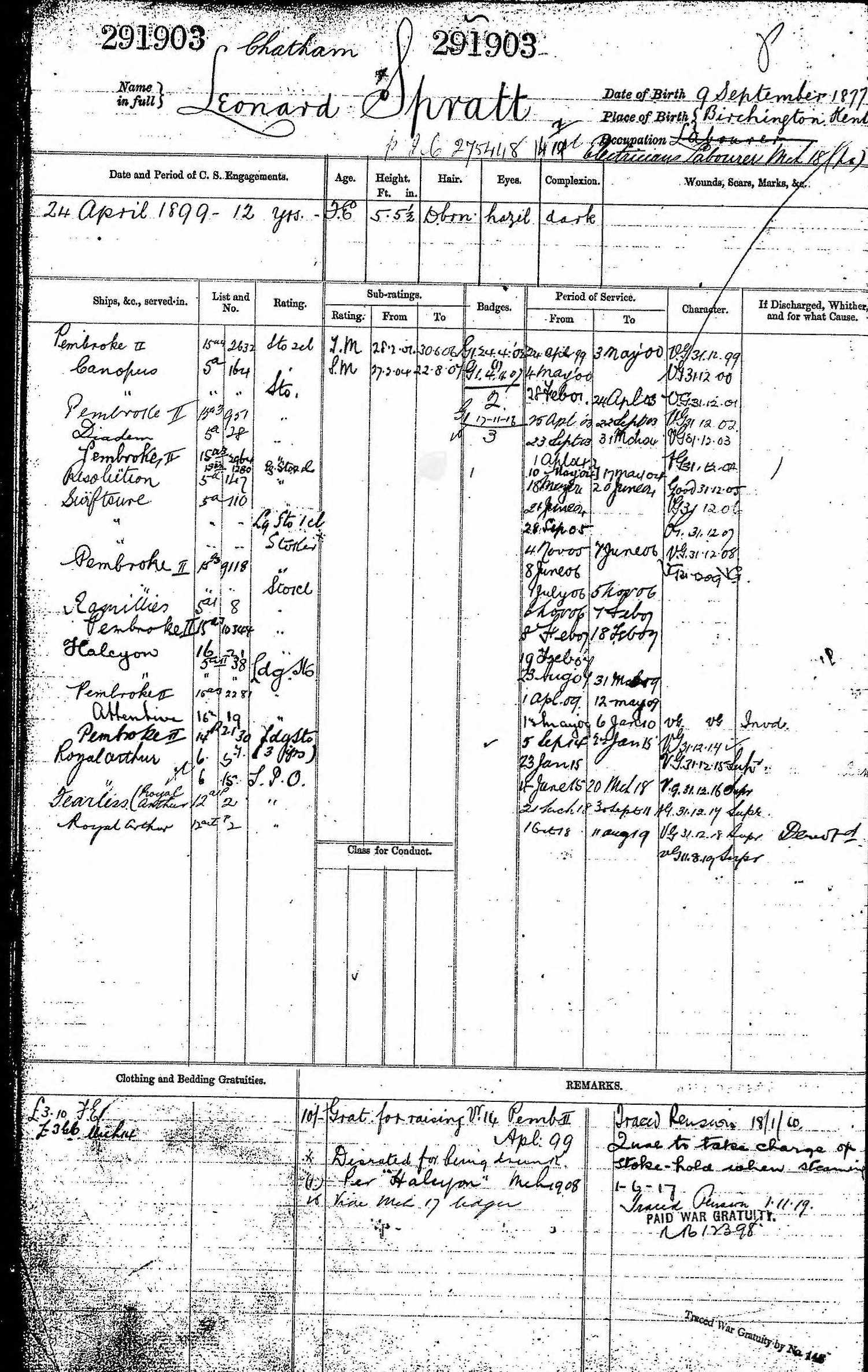Leonard Spratt - Naval Record