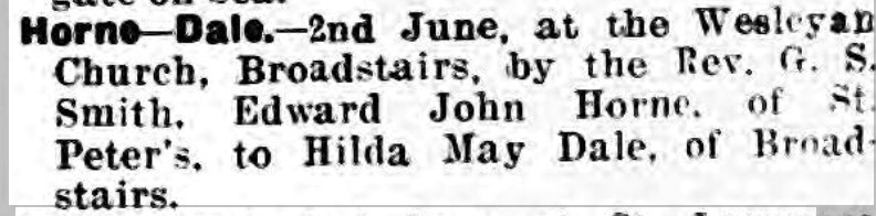 Edward Horne, the first cousin twice-removed on the father's side of Nigel Horne, was born in Broadstairs, Kent, England on Jun 12, 19091,2,3,4,5 and married Hilda Dale (with whom he had 3 children: Anthony J, Martin Stuart and Gillian T, along with 1 surviving child) at Wesleyan Church in Broadstairs on Jun 2, 19326.
