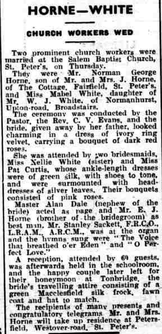 Norman Horne, the first cousin twice-removed on the father's side of Nigel Horne, was born in Broadstairs, Kent, England on Jul 2, 19161,2,3,4 and. He married Mabel White (with whom he had 2 surviving children Beryl C and Margaret J) at Salem Baptist Church, St Peters, Thanet, Kent, England on Aug 5, 19375.