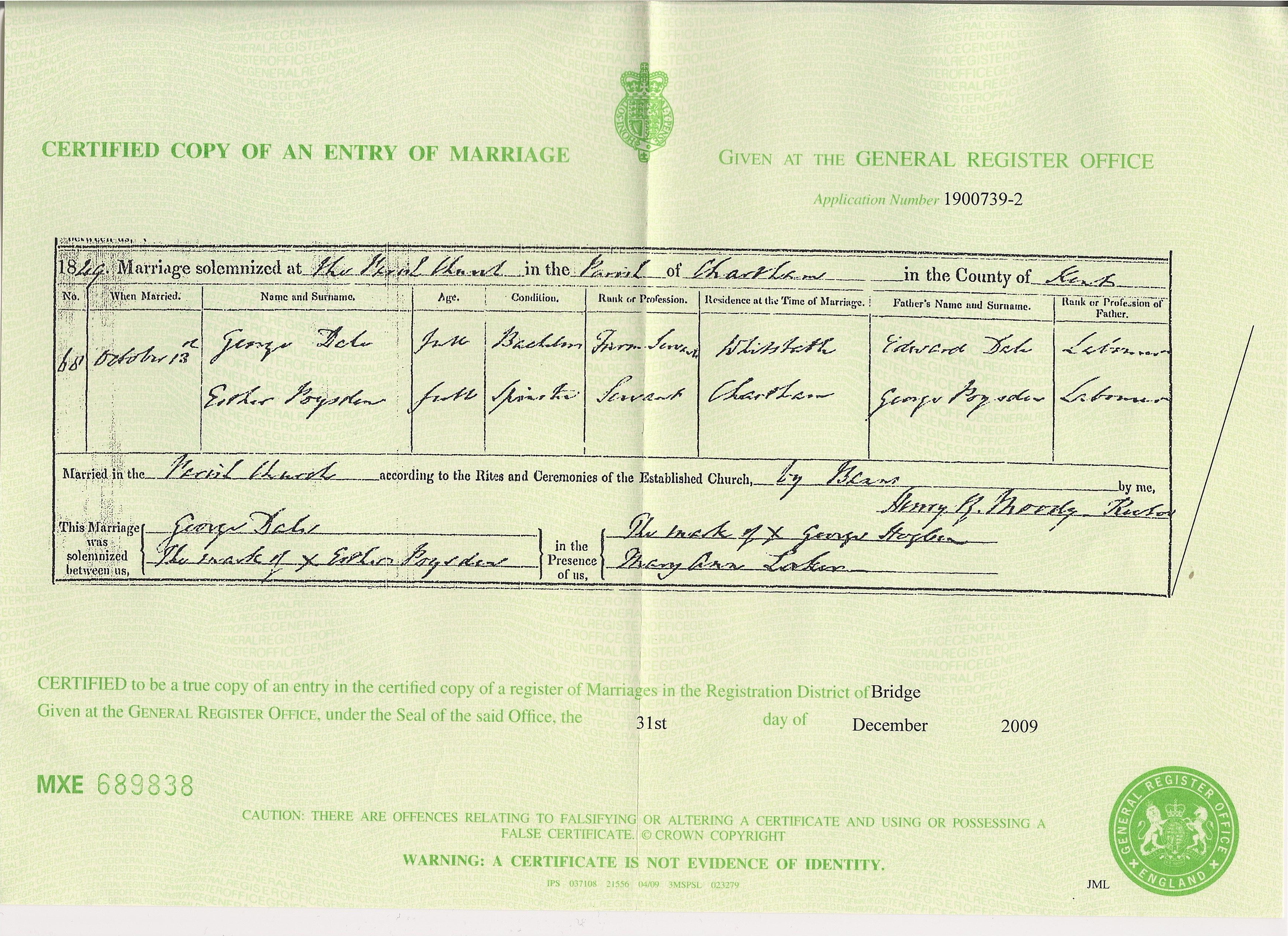 Esther Poysden, the great-great-grandmother of Nigel Horne, was born in Canterbury, Kent, England in 18251,2,3,4,5,6,7,8,9,10, was baptized in Blean, Kent, England on Jun 27, 1825 and married George Dale (an agricultural laborer with whom she had 9 children: George, Mary, Sophia, Sarah Ann, Edward, Esther Louisa, William Thomas, Henry and Leonard) at St Mary's Church, Chartham, Kent, England on Oct 13, 184911 (Chartham Parish Church).