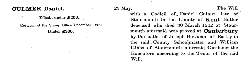 [ Home ] | [ Calendar ] | [ Surnames Index ] | [ Family History ]A butler and the son of John Culmer (a parish clerk) and Sarah Hawkes,