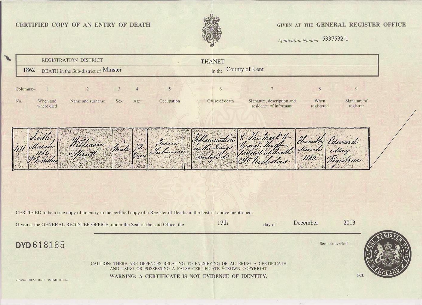 He died on Mar 6, 1862 in St Nicholas-at-Wade4 (inflammation of the lungs) and was buried there on Mar 13, 1862 (aged 72yrs. Verified at Margate library 24 Mar 2010)6,7.