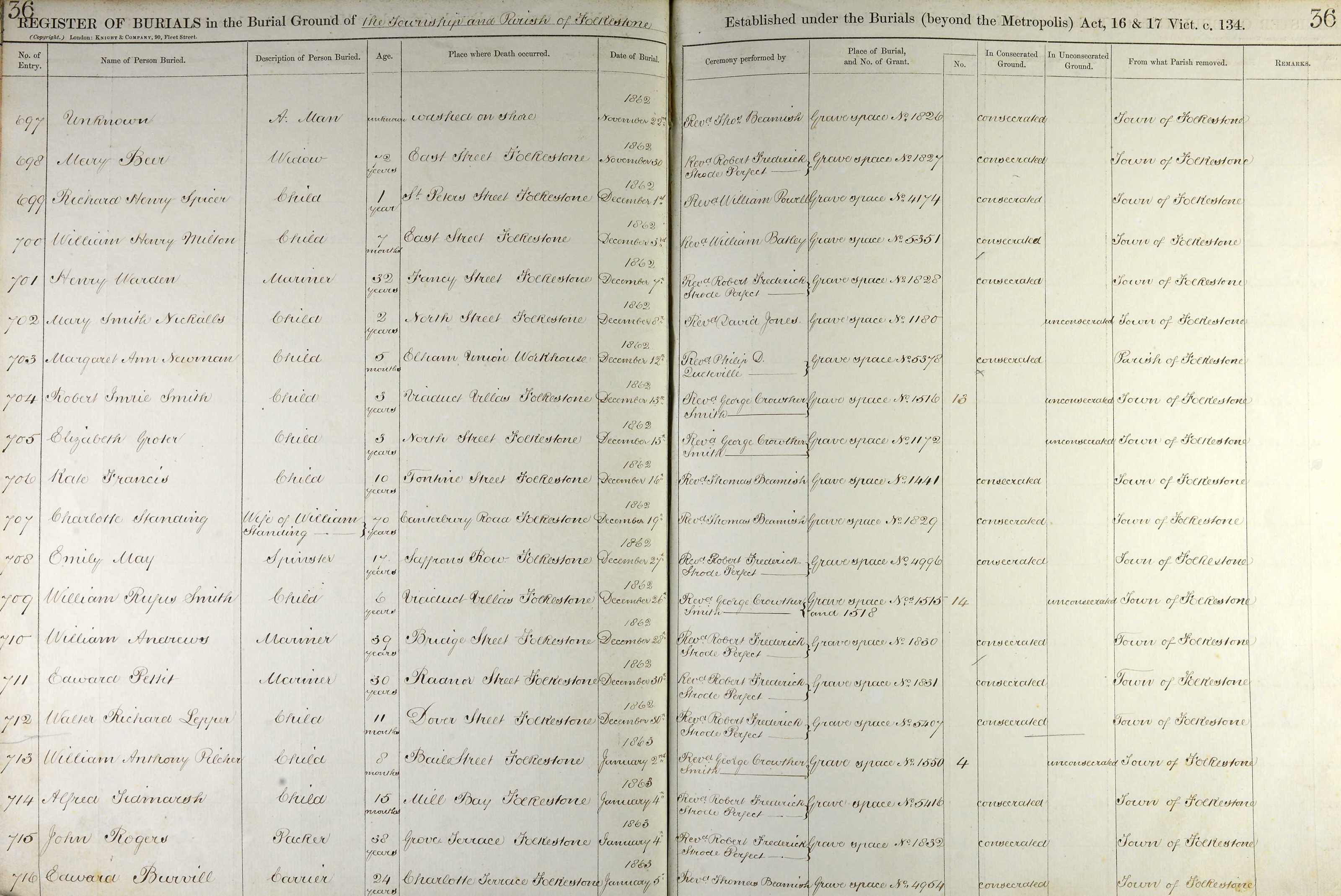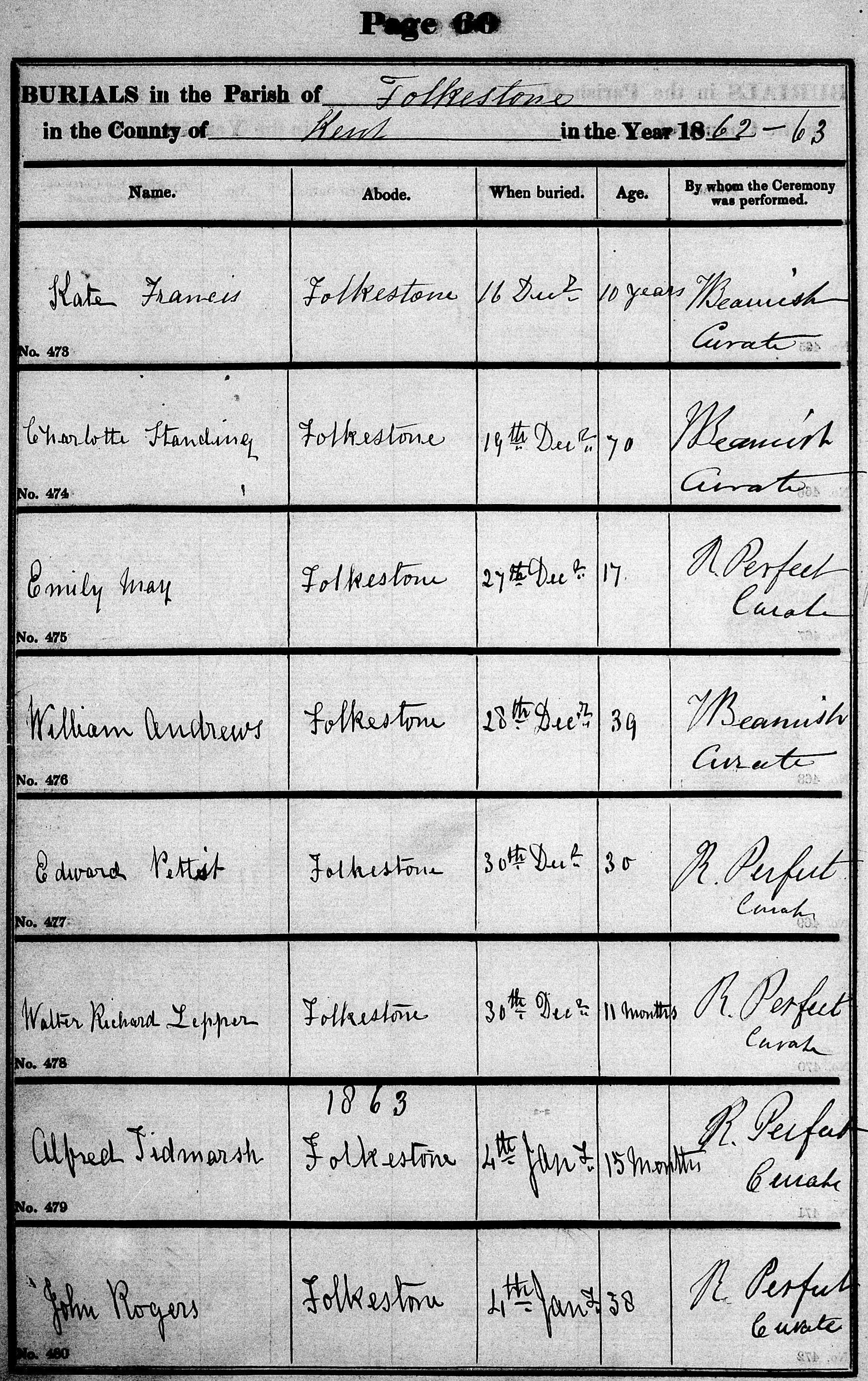She died on Dec 13, 1862 on Canterbury Road in Folkestone3 (apoplexy) and was buried at Cheriton Road Cemetery, Folkestone on Dec 19, 1862.