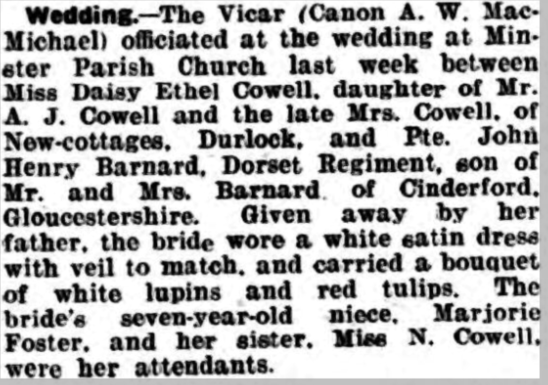 [ Home ] | [ Calendar ] | [ Surnames Index ] | [ Family History ]John Barnard, the husband of Daisy Ethel Cowell (the first cousin once-removed on the mother's side of Nigel Horne), was born on May 11, 19201 and. He married Daisy (with whom he had 1 surviving child) in Minster, Thanet, Kent, England around May 19432.