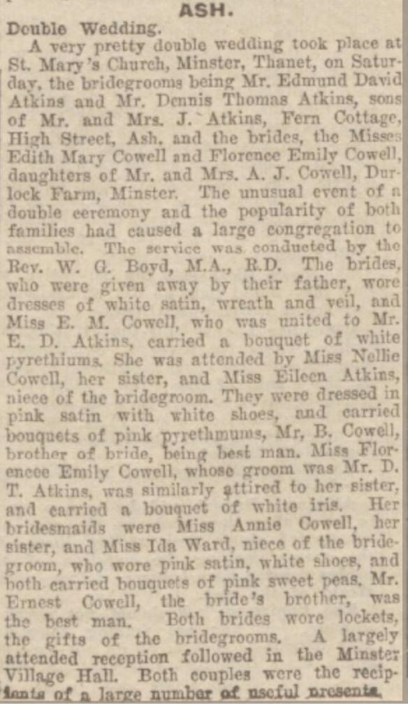Dennis Atkins, the husband of Florence Emily Cowell (the first cousin once-removed on the mother's side of Nigel Horne), was born in Tilmanstone, Kent, England on Dec 22, 19061,2,3, was baptized there on Feb 21, 1907 and married Florence (with whom he had 1 child, Robert Francis) in Thanet, Kent, England on Jun 4, 19324. On Sep 29, 1939, he lived on Little Knell Farm Cottage, Knell Lane, Ash, Kent1.